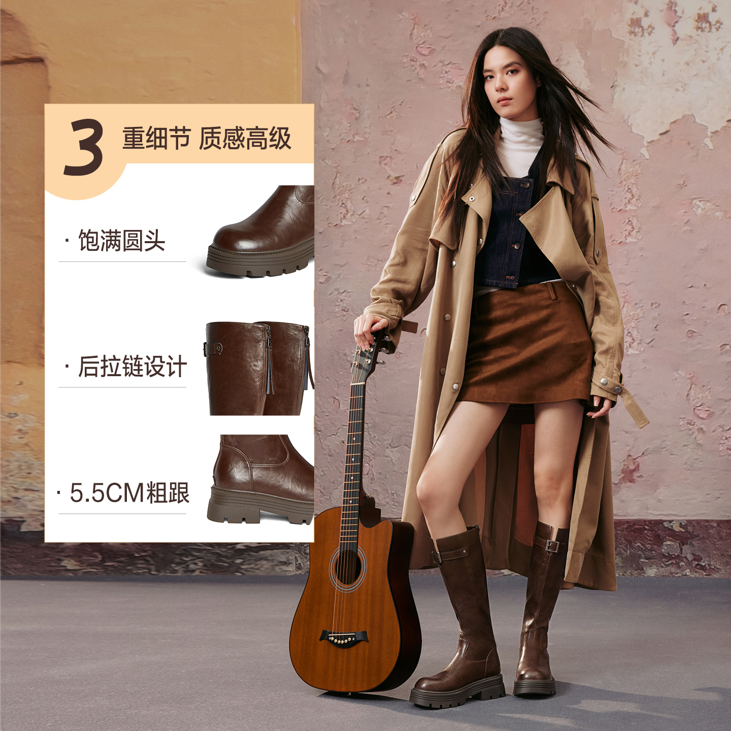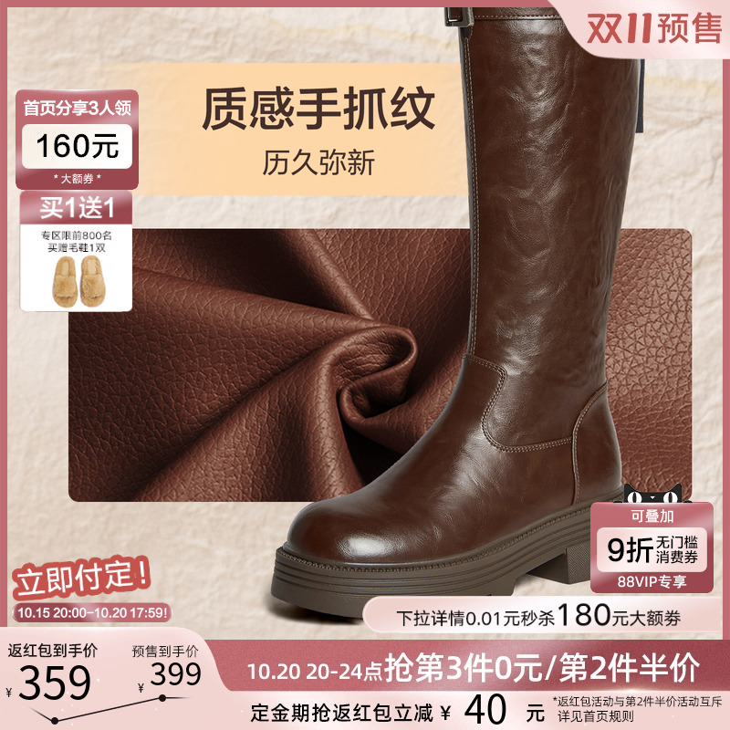 双11预售百思图25冬商场新款 棕色骑士靴粗跟女长靴F2021DG5