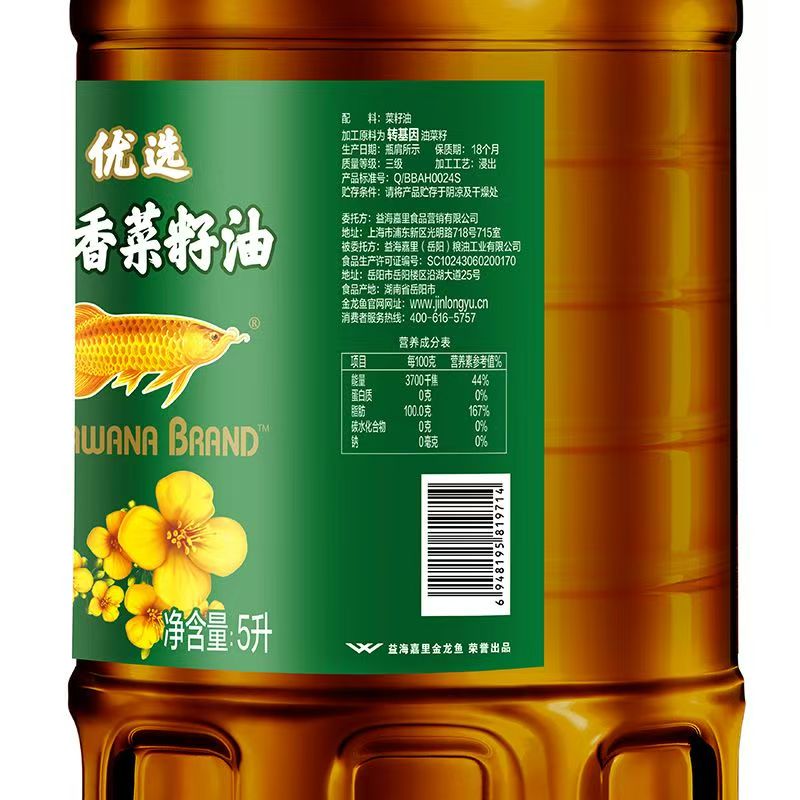 金龙鱼优选纯香菜籽油5L食用油健康家用炒菜油植物油官方正品