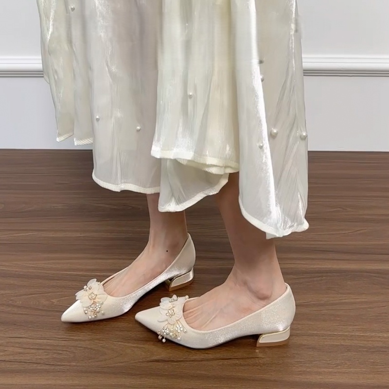 粗跟日常可穿单鞋 女尖头不累脚缎面孕妇可穿单鞋 花朵低跟婚鞋 法式