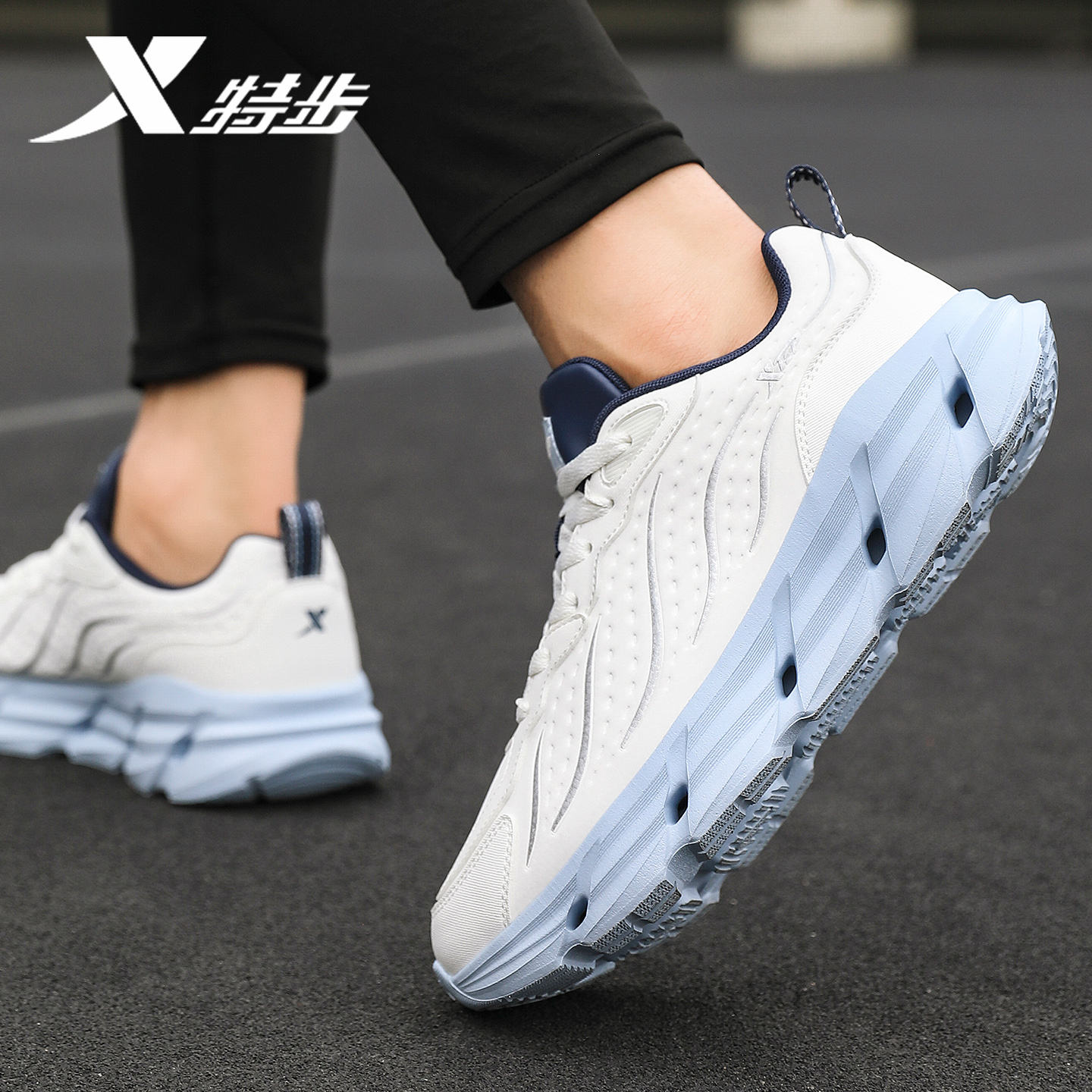 2025新款 白色跑步鞋 秋季 缓震轻便运动鞋 男 防水休闲鞋 特步皮面男鞋