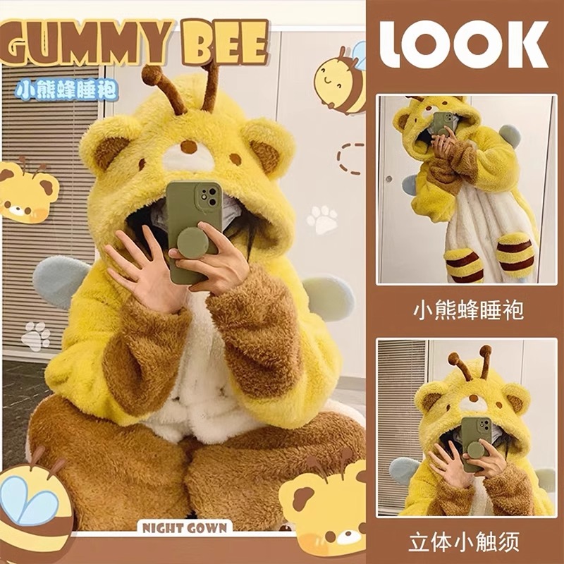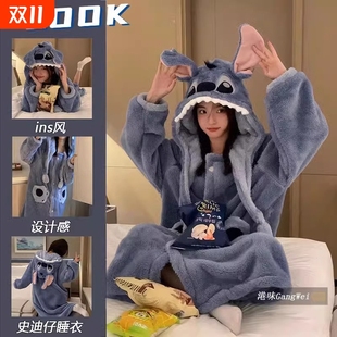 秋冬珊瑚绒史迪仔可爱睡袍女加绒加厚宽松长款 睡裙学生家居服外穿