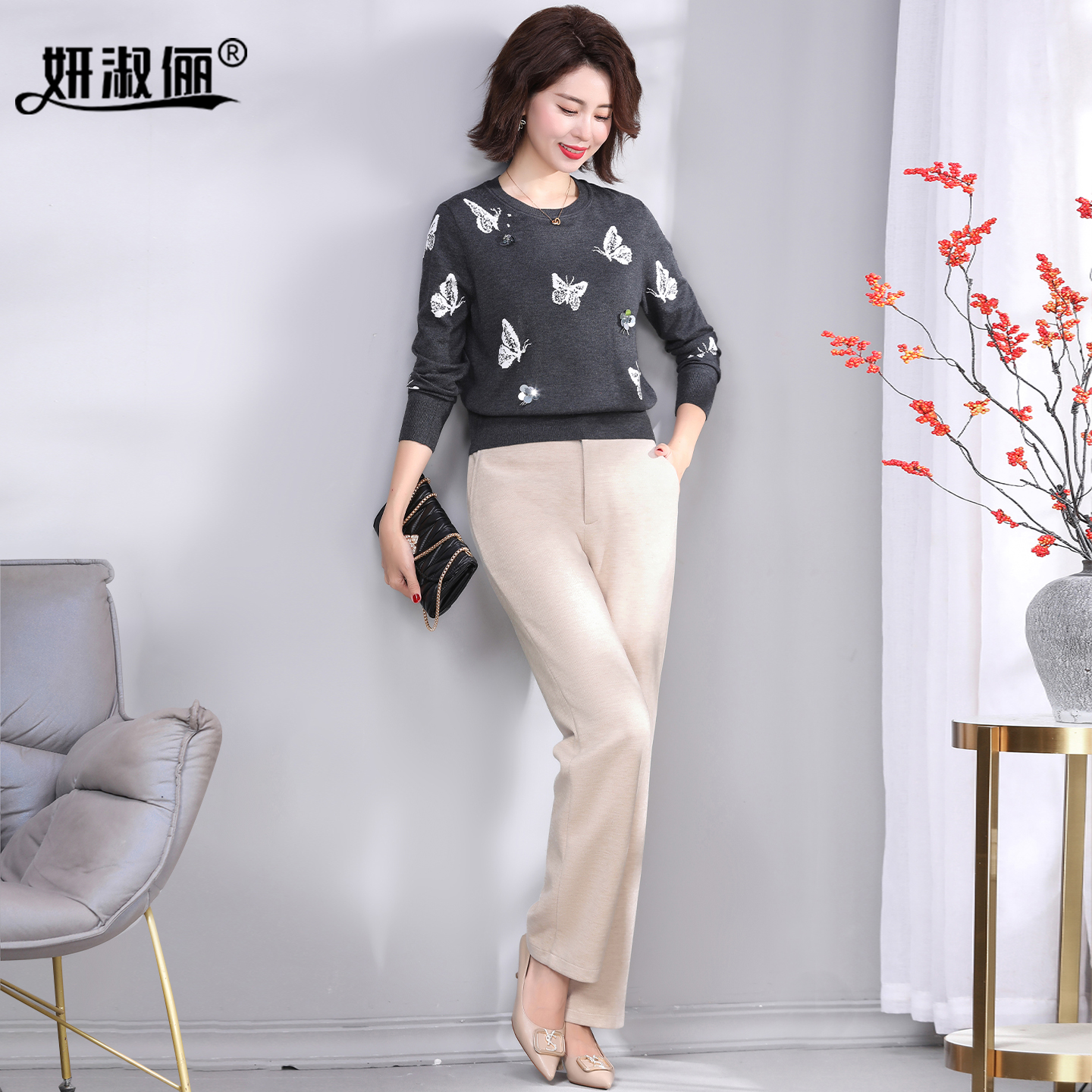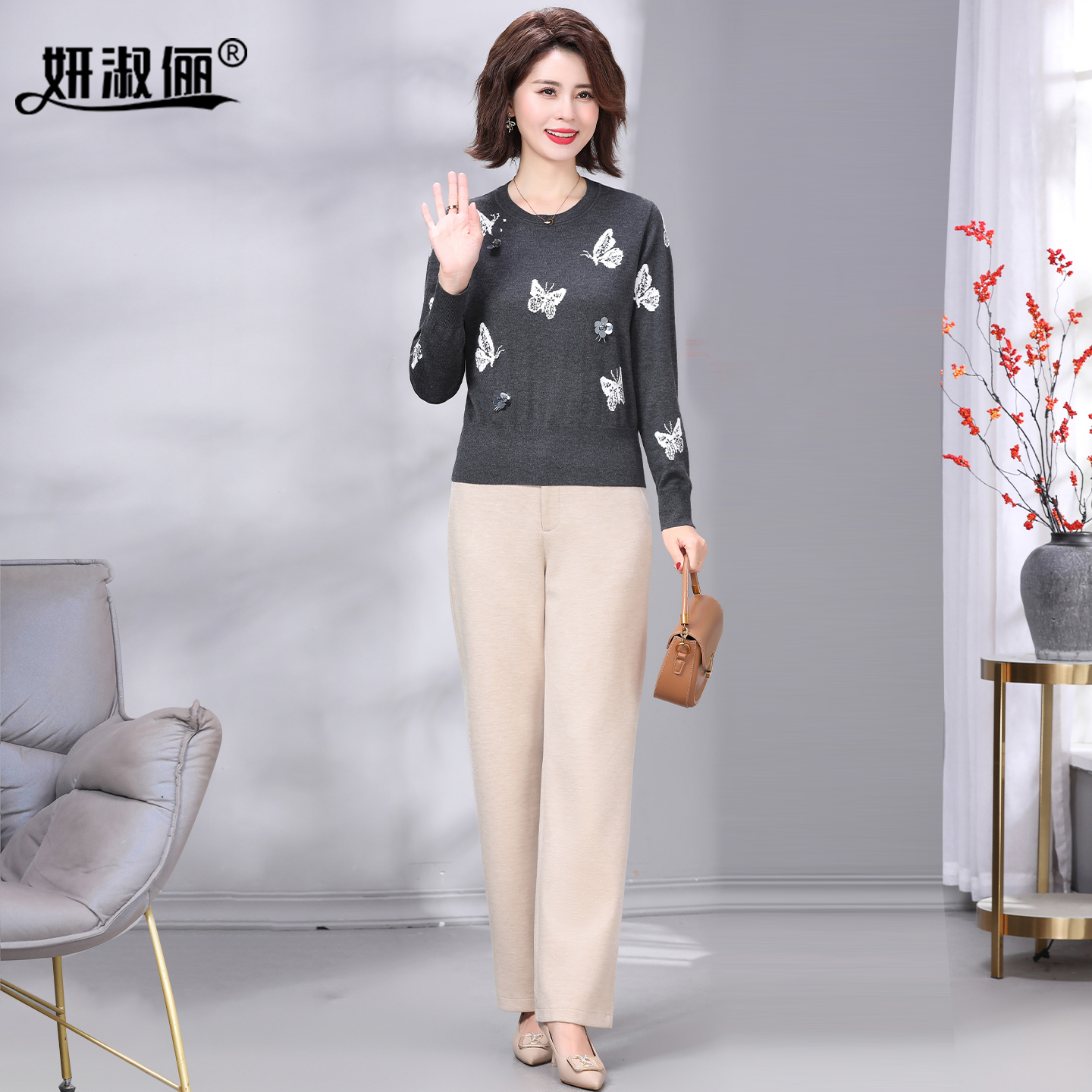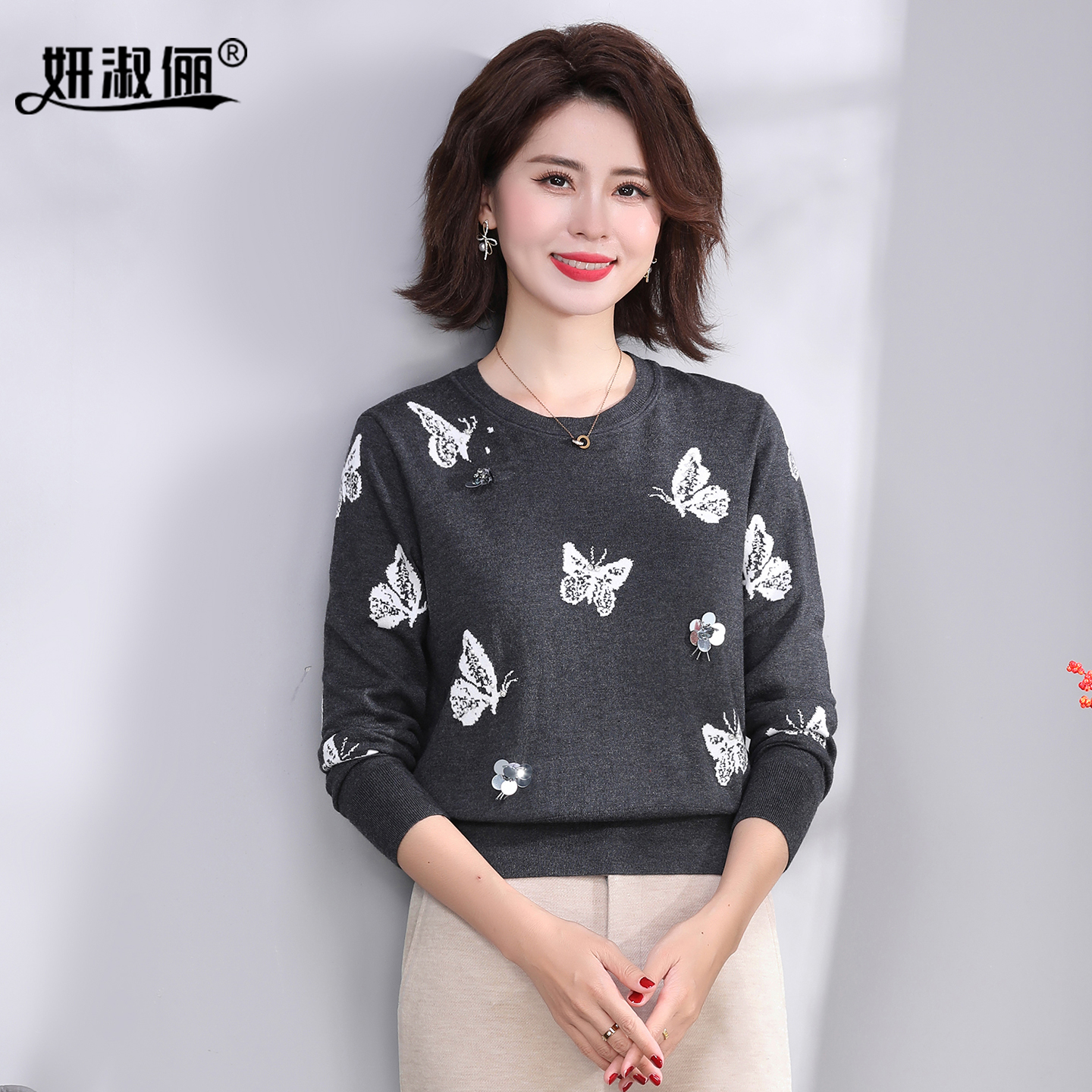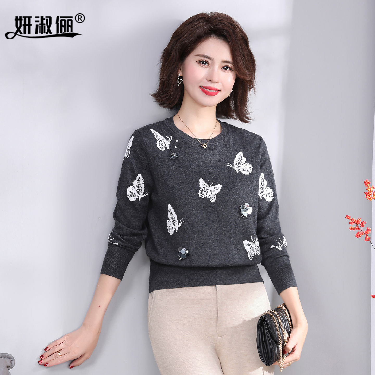 羊毛针织衫 立体刺绣圆领套头宽松上衣2025妈妈洋气高级感蝴蝶毛衣