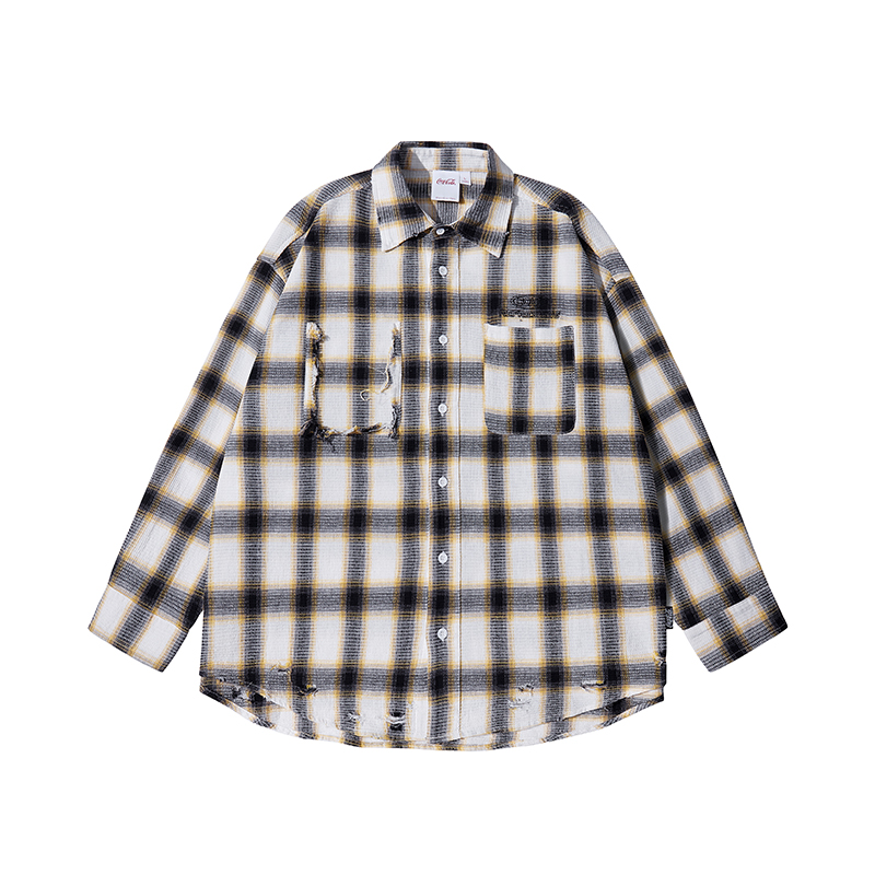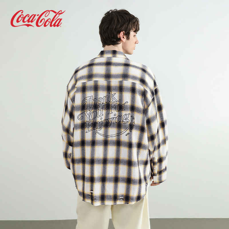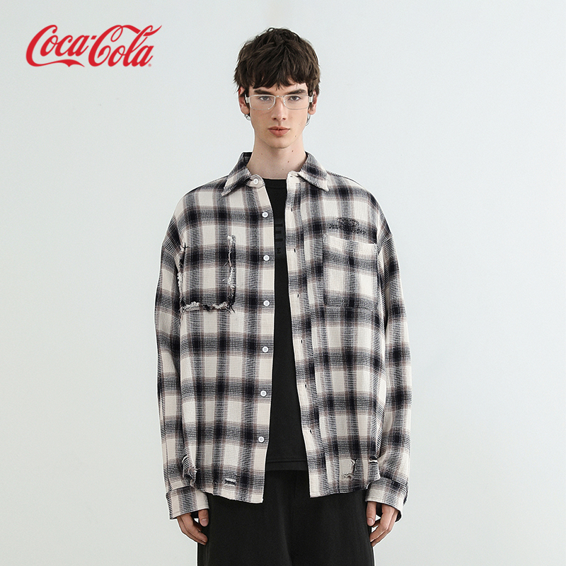 男女同款 衬衫 镂空毛边口袋破洞格子条纹长袖 coke可口可乐