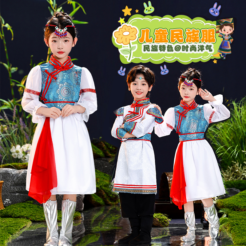 新款 儿童蒙古族少数民族蒙古袍男女童练功服白马筷子舞蹈演出服饰