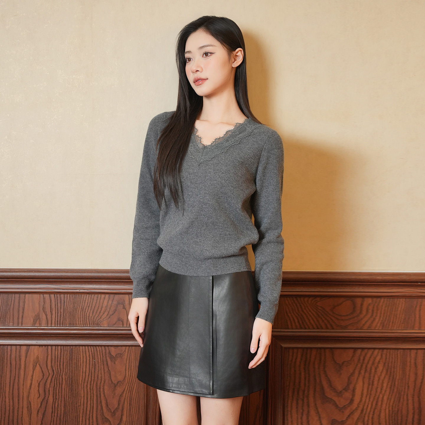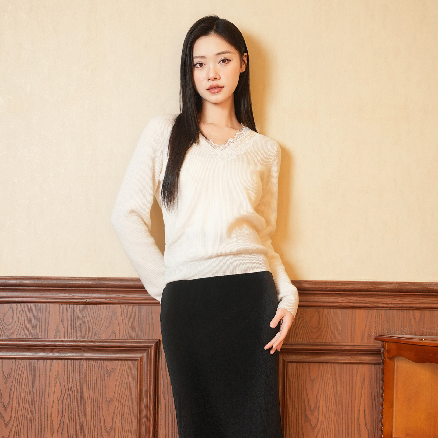 绵羊毛蕾丝针织衫 新款 奕辰2025秋季 浪漫气质V领长袖 商场同款