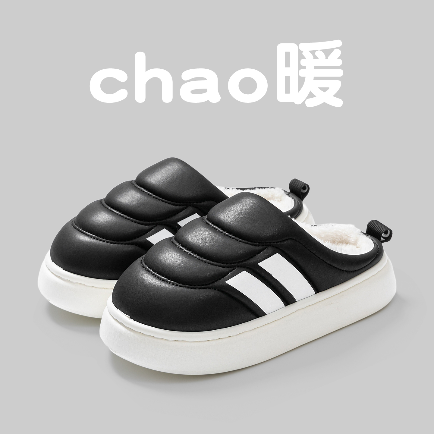 室内居家加绒保暖防滑情侣拖鞋 秋冬季 可外穿 男女款 皮面防水棉拖鞋