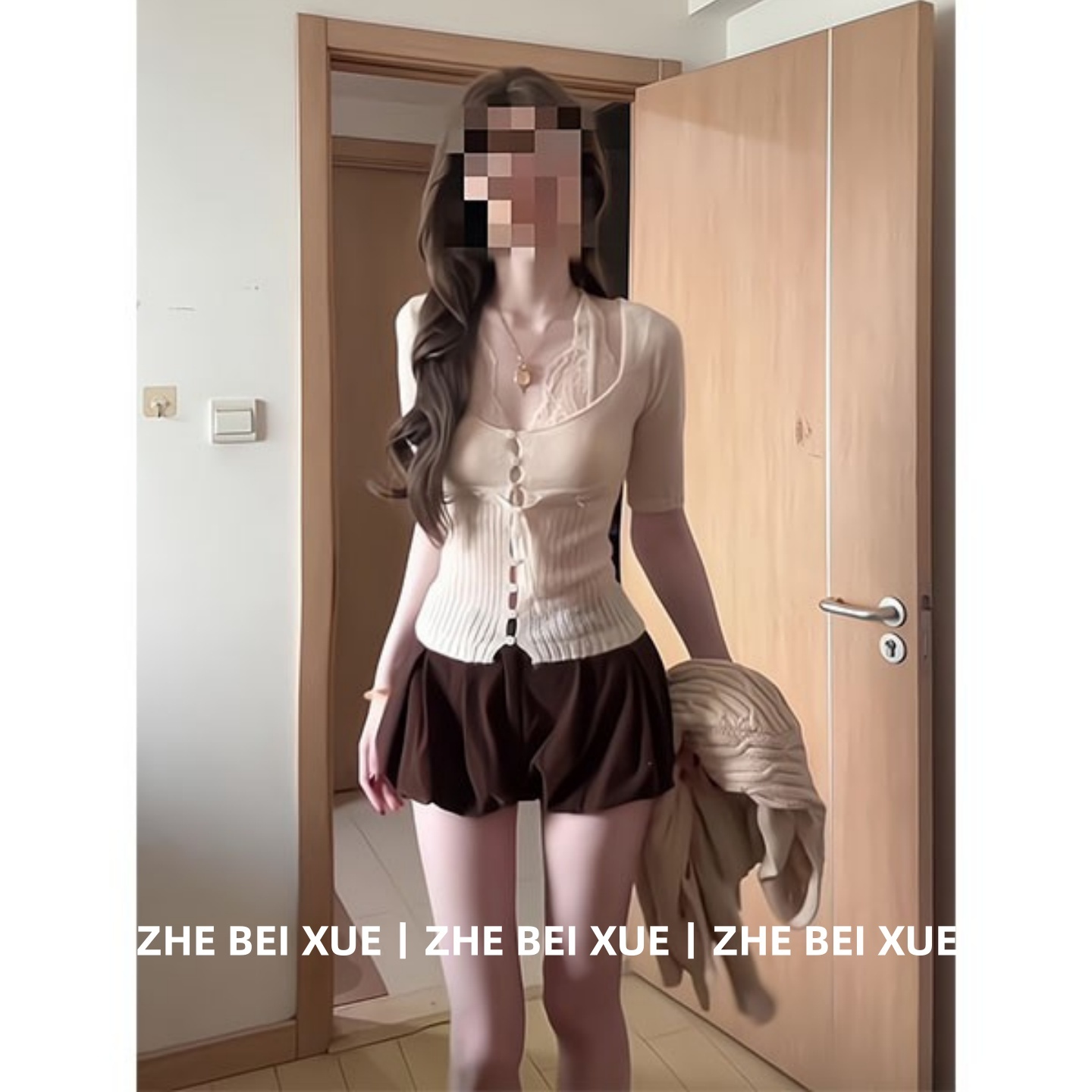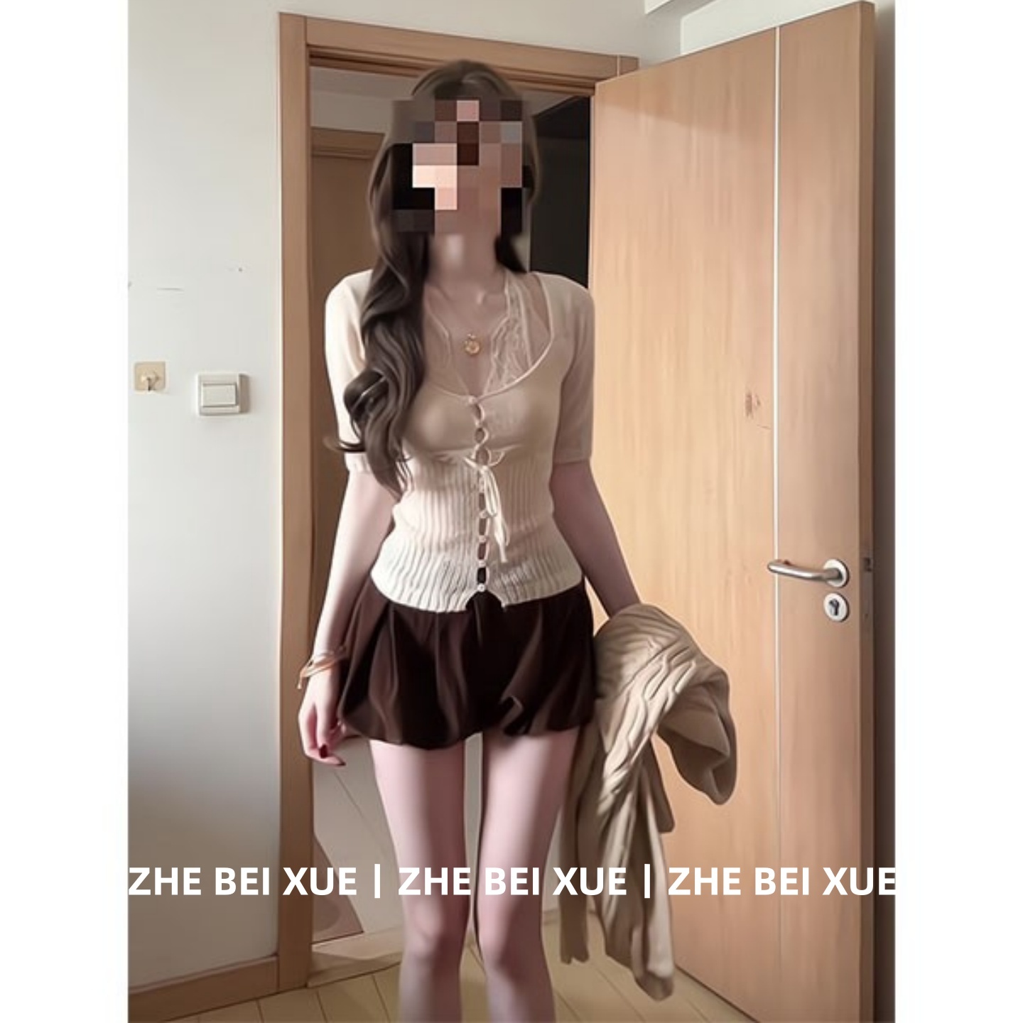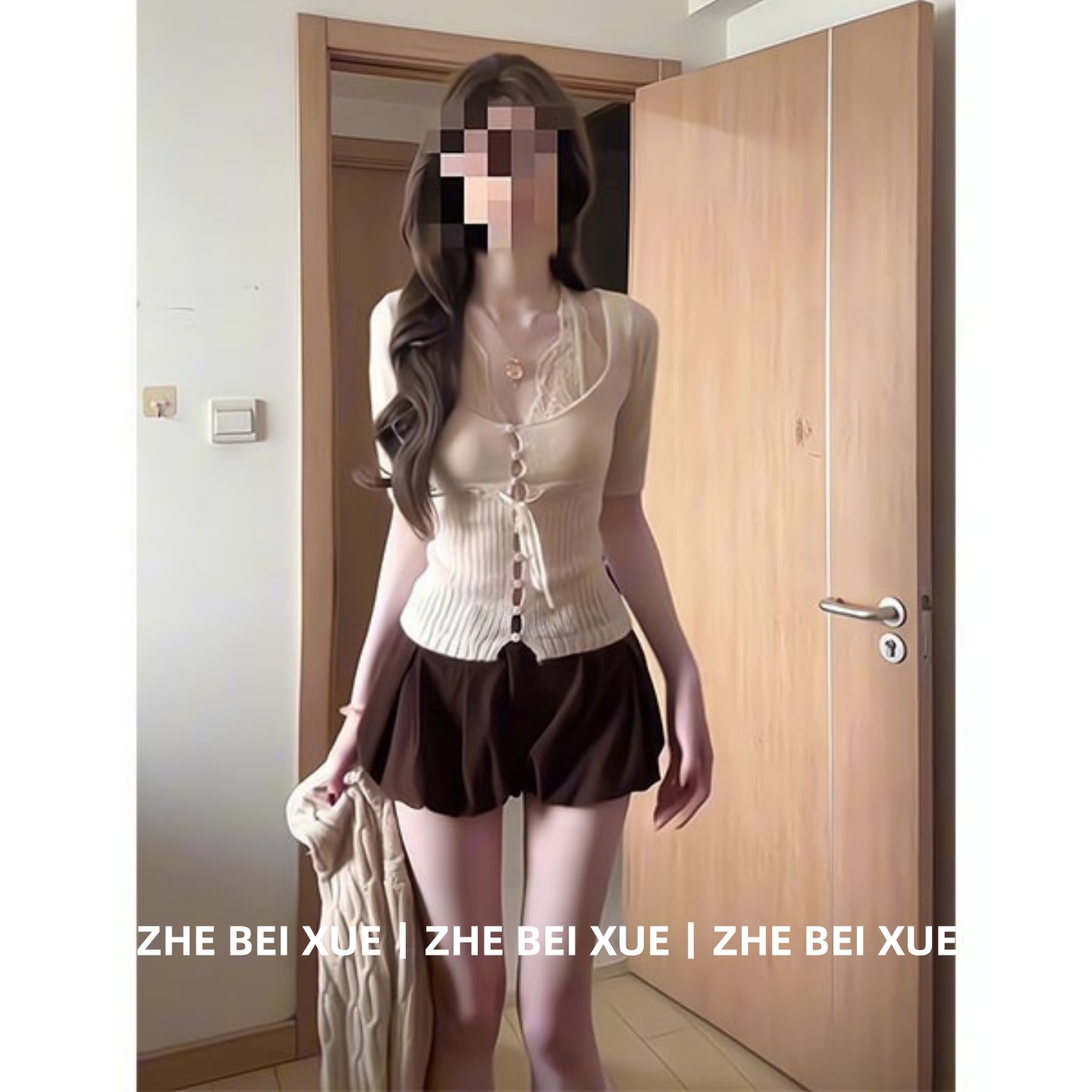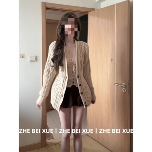 花苞短裤 毛衣外套开衫 长袖 气质一整套ootd穿搭u领挂脖绑带针织衫