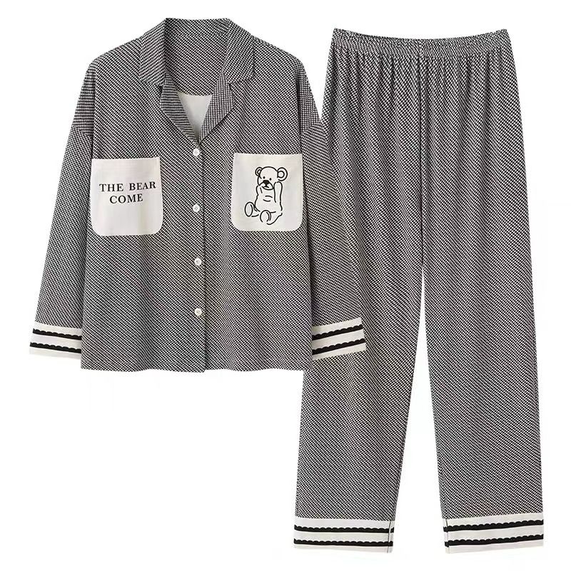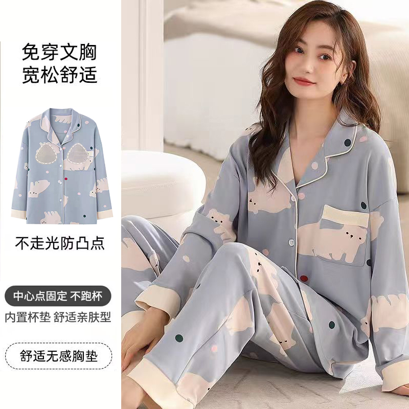 长袖 家居服夏季 新款 春秋季 针织棉外穿带胸垫 套装 睡衣女春秋春秋款