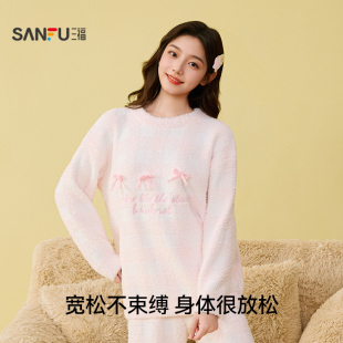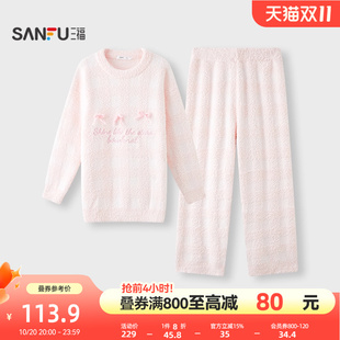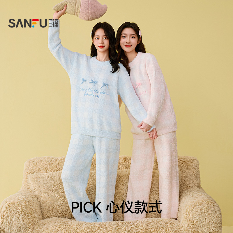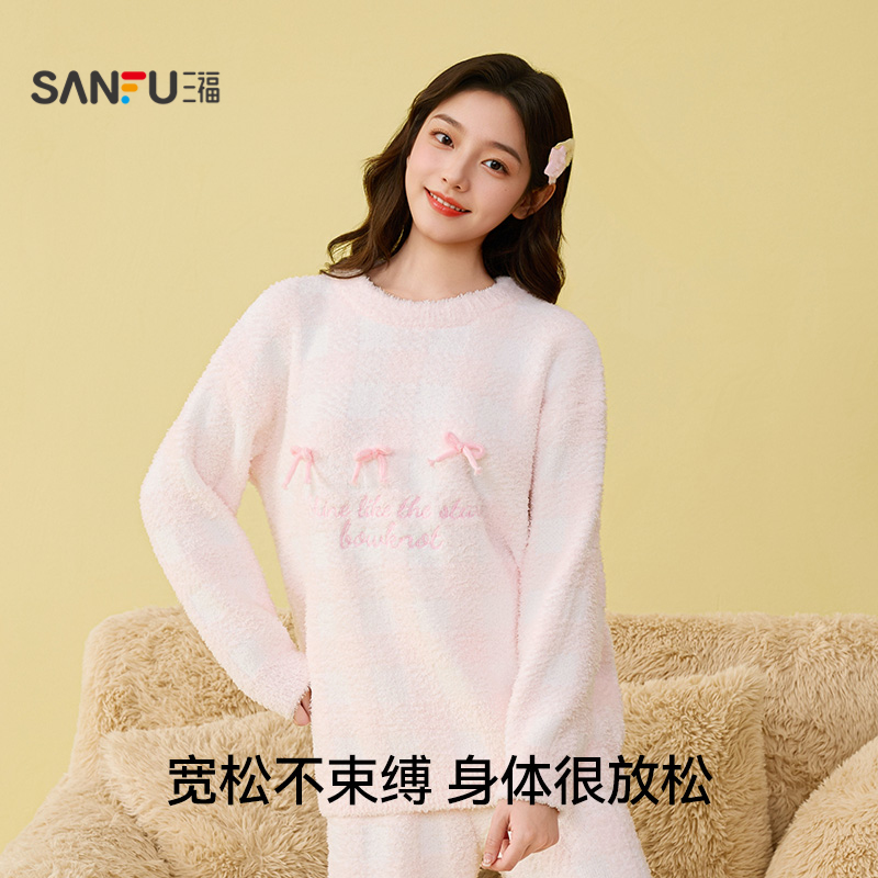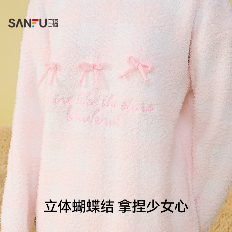 趣味立体蝴蝶结家居服508407 格子半边绒睡衣套装 三福女冬季