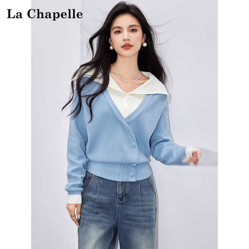 新款 拉夏贝尔蓝色假两件长袖 秋季 女装 翻领轻奢气质撞色上衣 针织衫