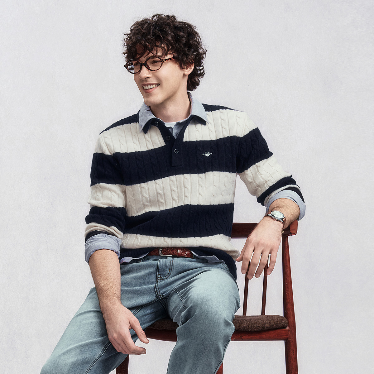 休闲纯绵羊毛衫 GANT 翻领美式 条纹毛衣绞花针织衫 甘特25秋冬男士