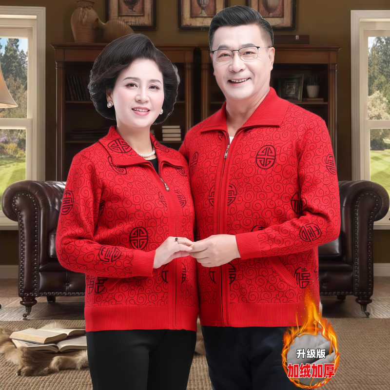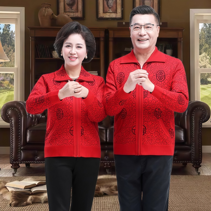 本命年红色爷爷奶奶过寿毛衣 爸爸妈妈情侣装 2025新款 中老年人开衫