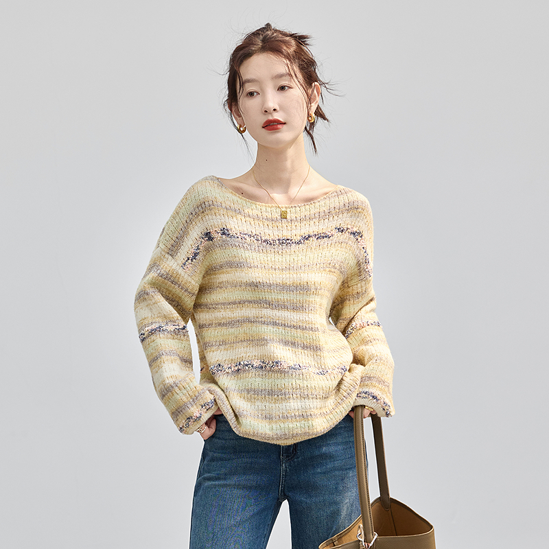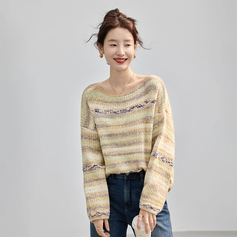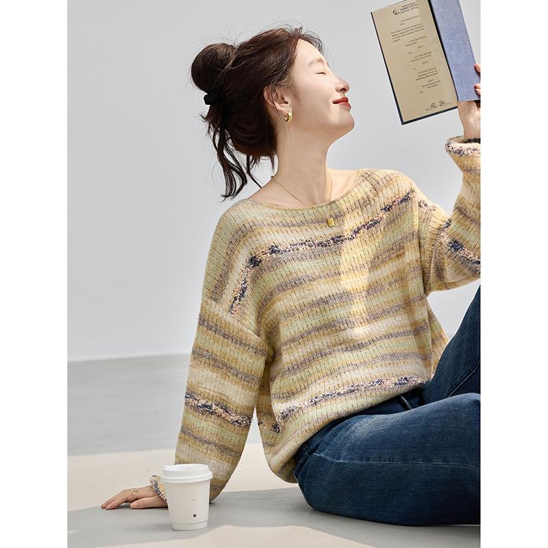 女装 温柔淑女撞色条纹含绵羊毛针织毛衣套头衫 上衣 新款 2025年秋季