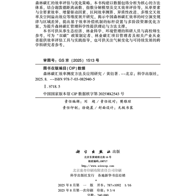 衍 黄 著 本书可供从事生态经济科研人员与高校师生参考 社9787030829405 现货速发 科学出版 森林碳汇效率测度方法及应用研究