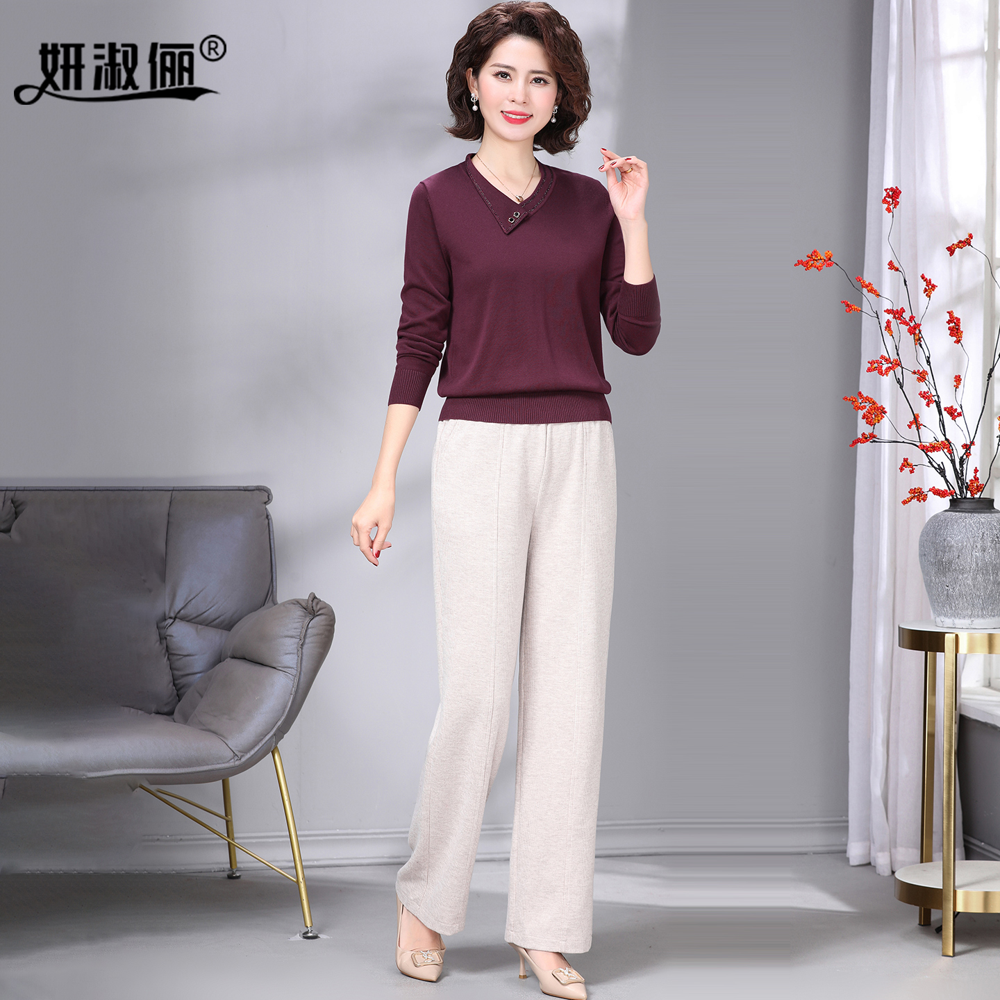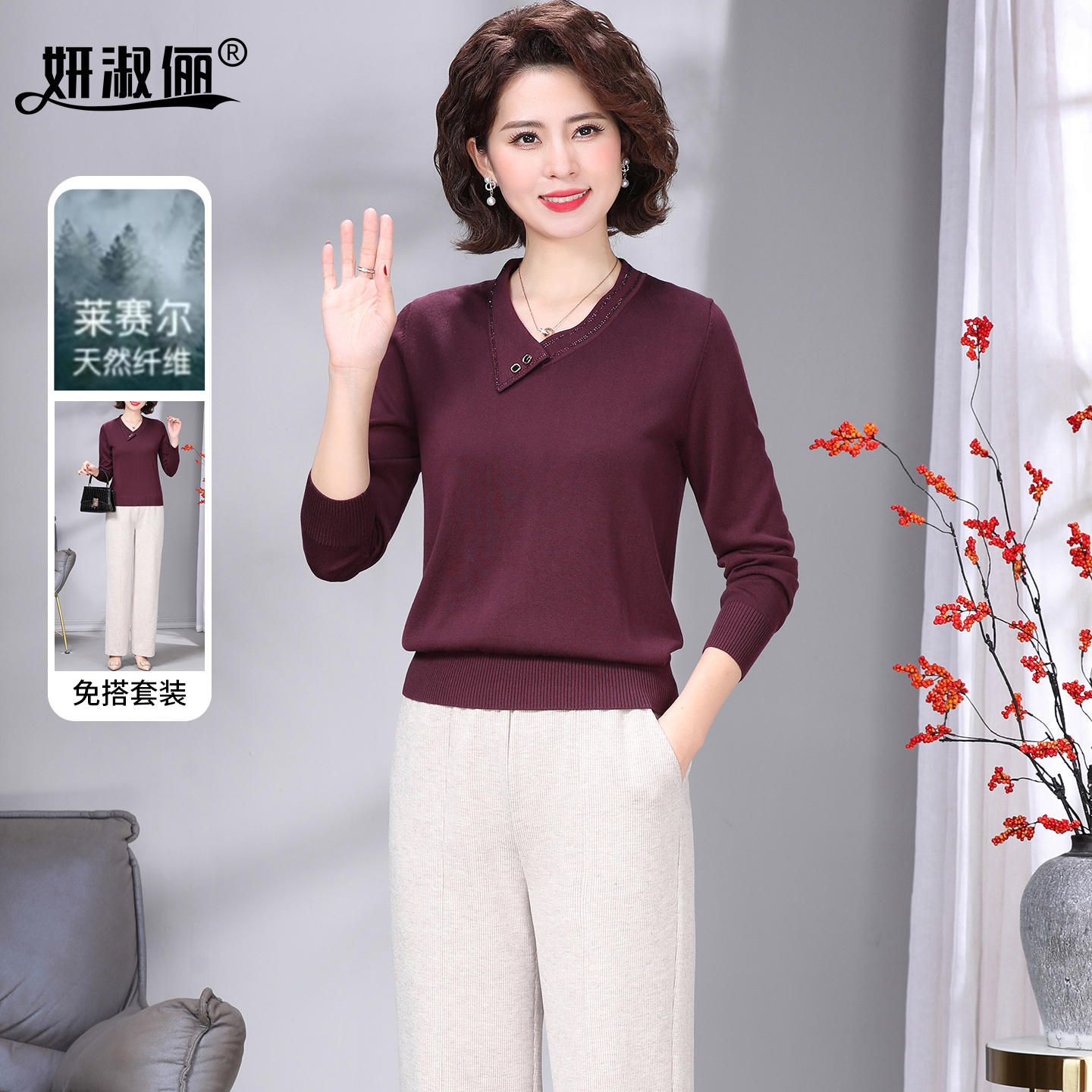 天丝针织衫 高档套装 长袖 中年妈妈秋上衣洋气小衫 2025新款 高档正品