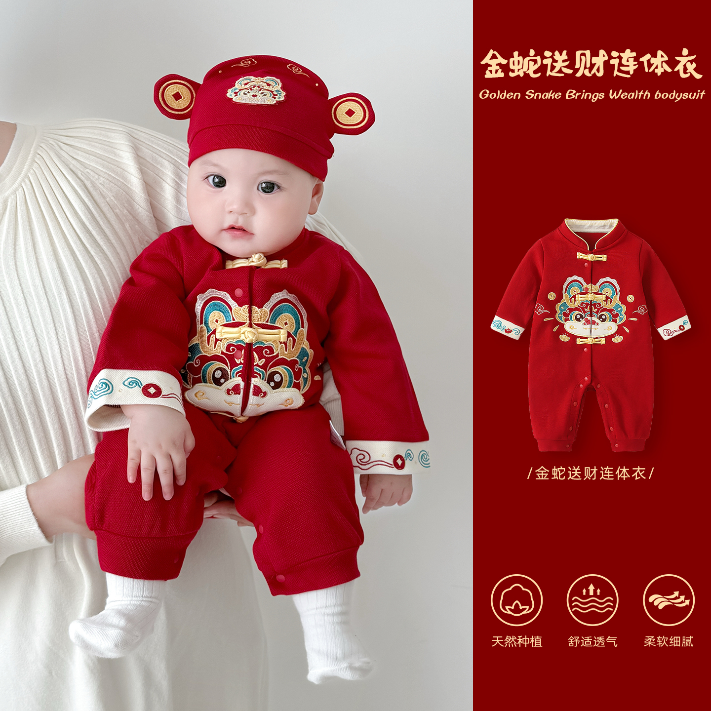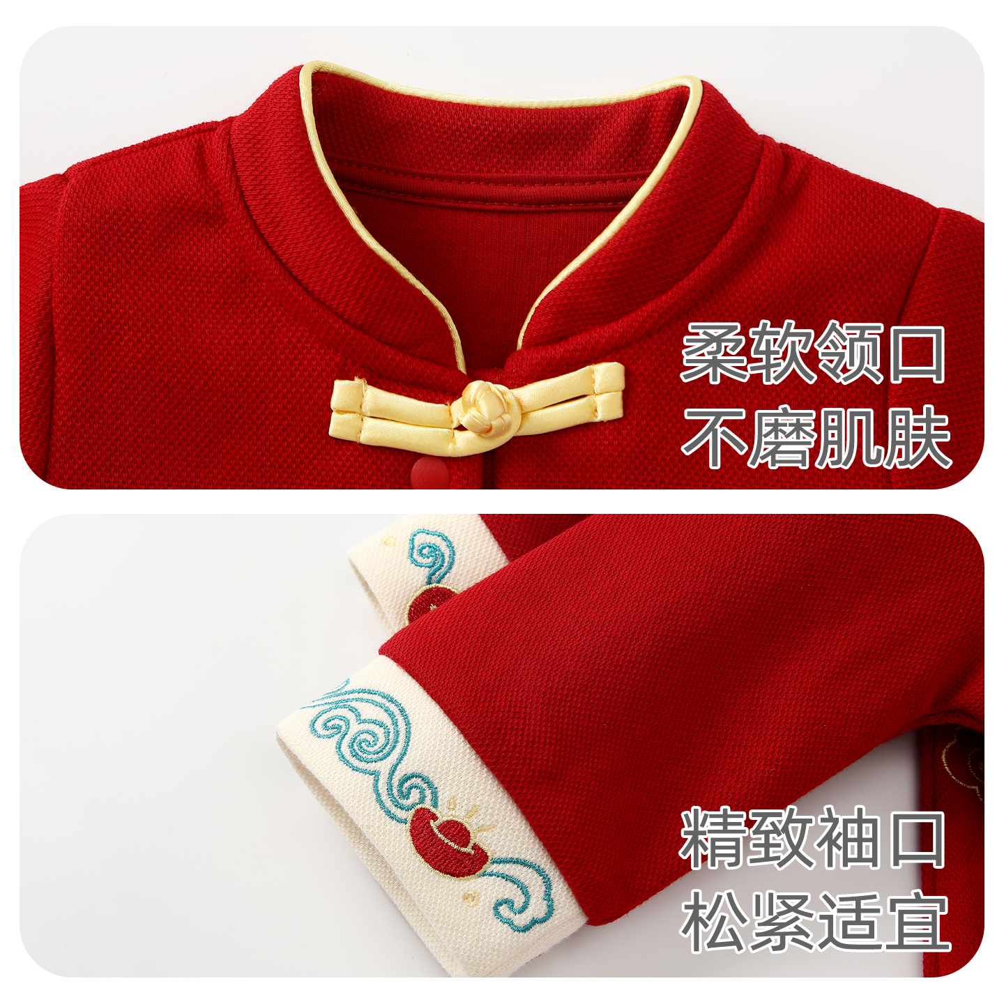 婴儿周岁礼服秋冬连体衣小月龄国风长袖 红色抓周衣服 哈衣宝宝秋季