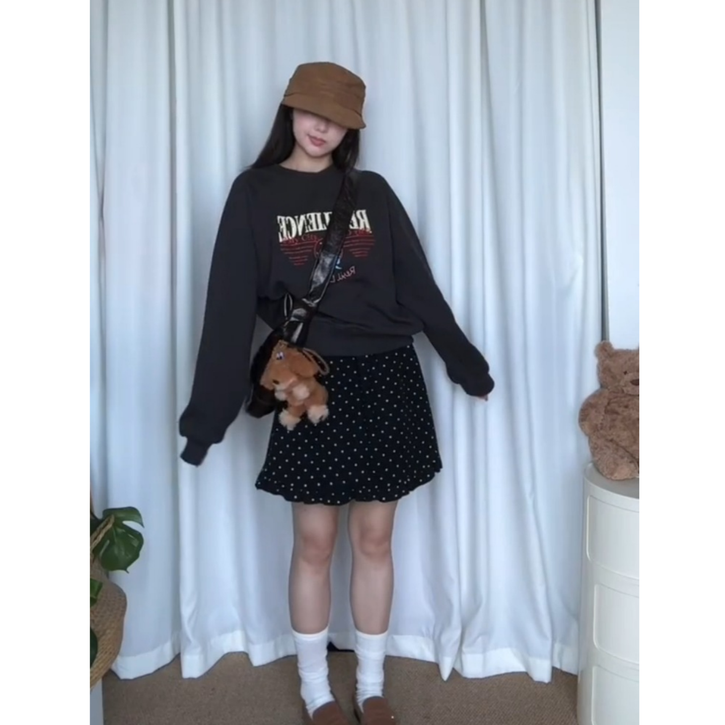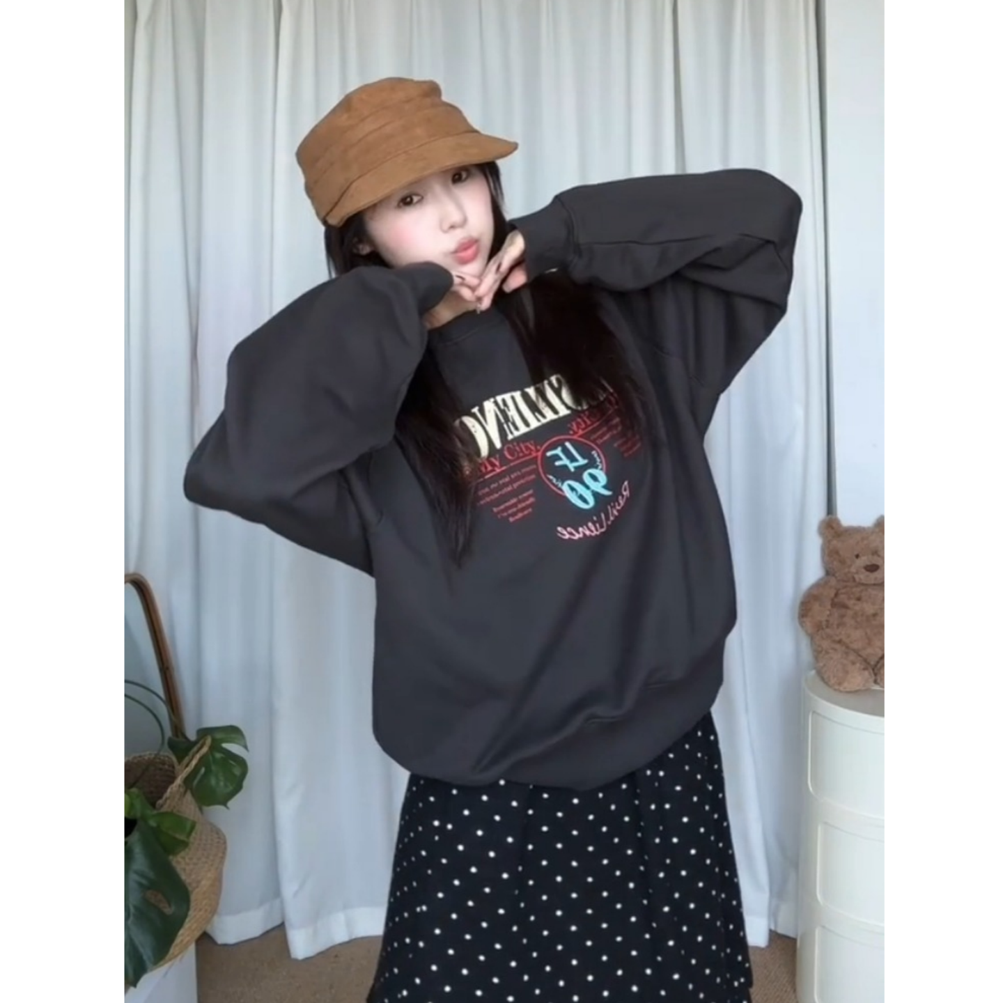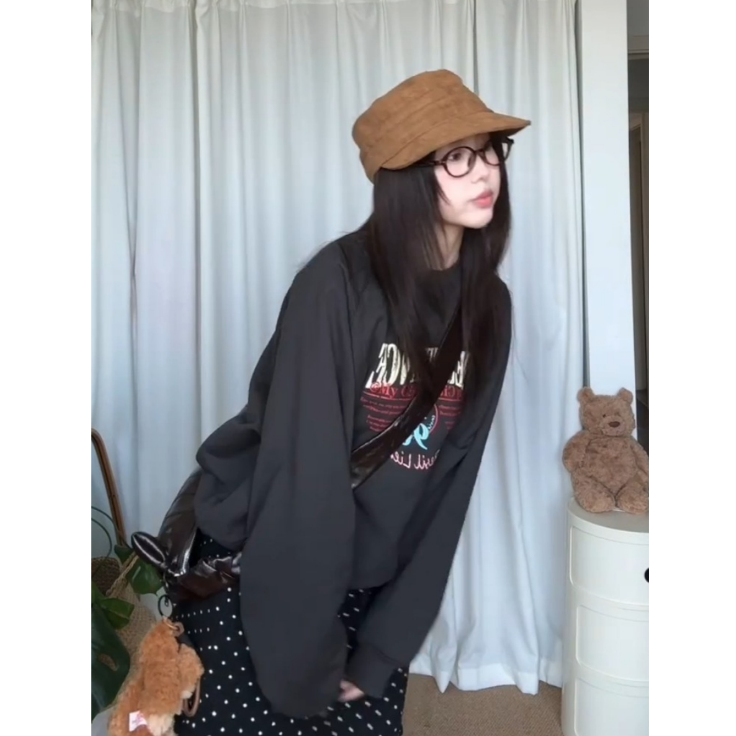 甜酷上衣秋 慵懒chic高级感短款 深灰色印花圆领卫衣女2025新款 美式
