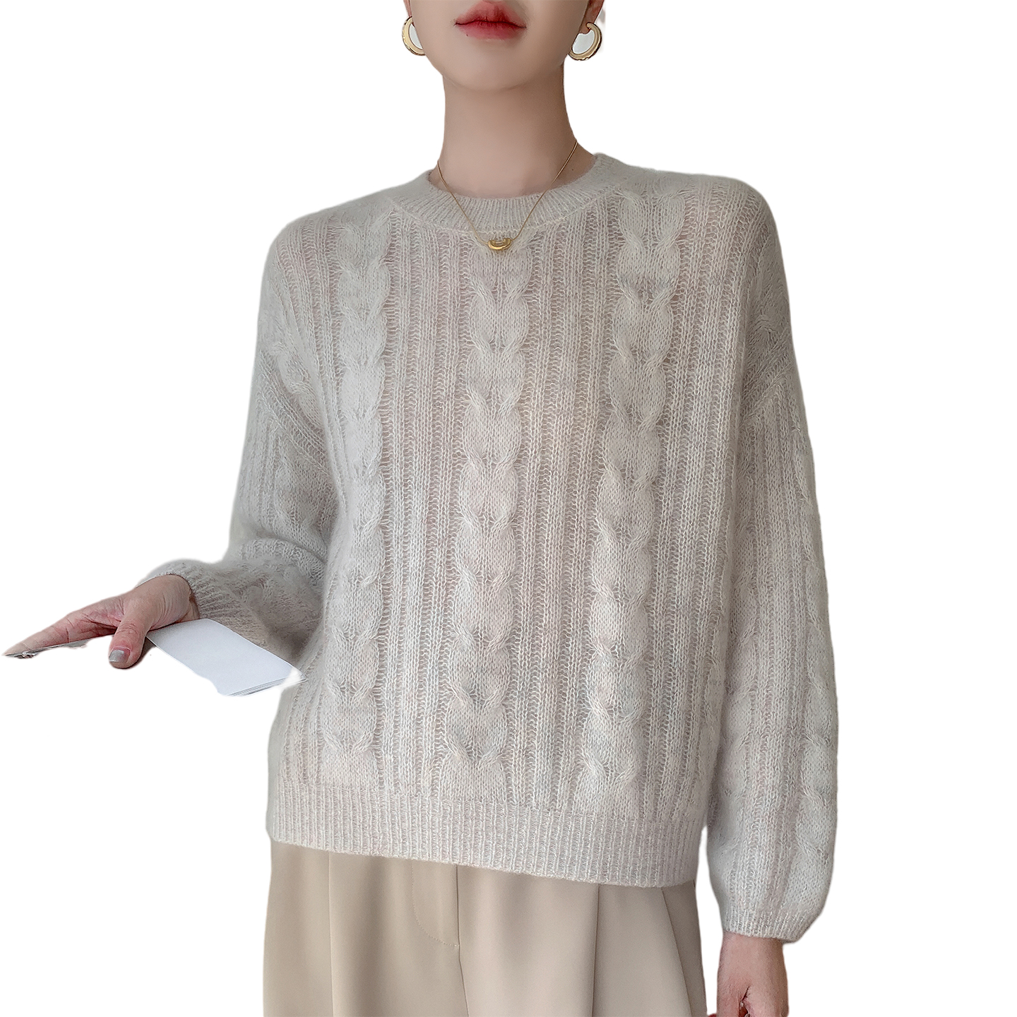 25秋冬新款 女圆领绞花宽松针织上衣毛衣 亲肤柔软扭花桑蚕丝羊绒衫