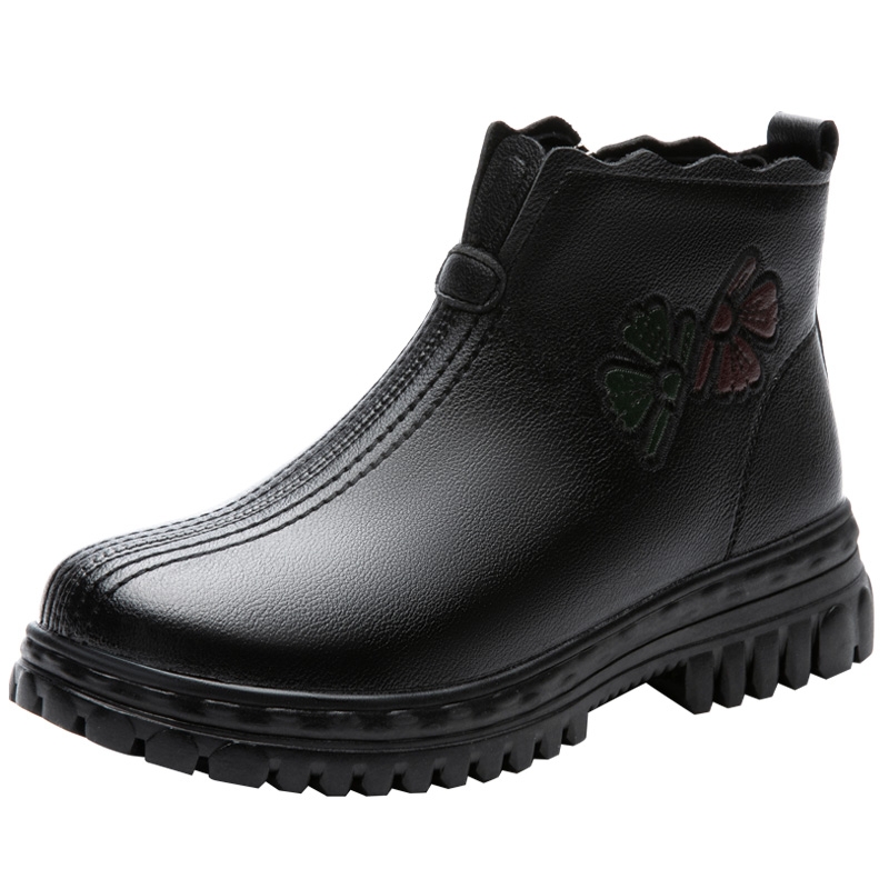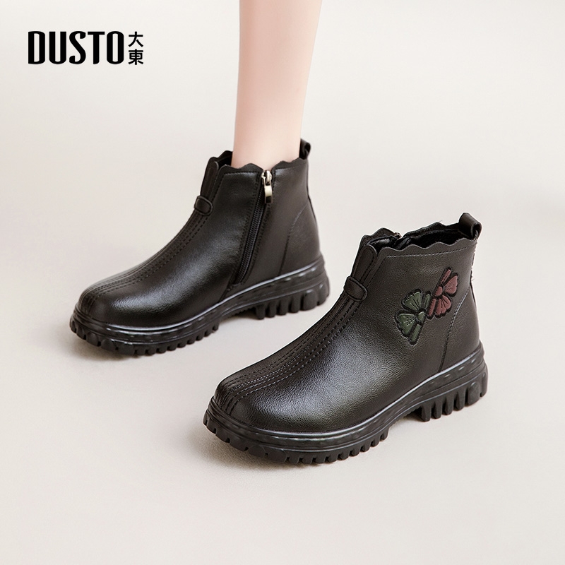 大东黑色皮靴女2025新款 加绒保暖棉靴软底防滑中老年妈妈短靴 冬季