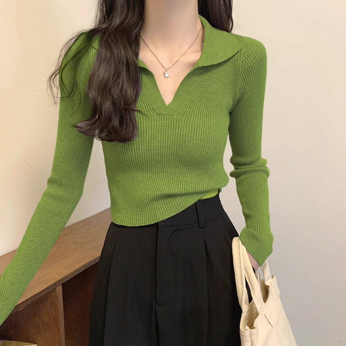 显瘦内搭别致打底衫 绿色POLO领长袖 修身 女2025新款 上1010c 针织衫