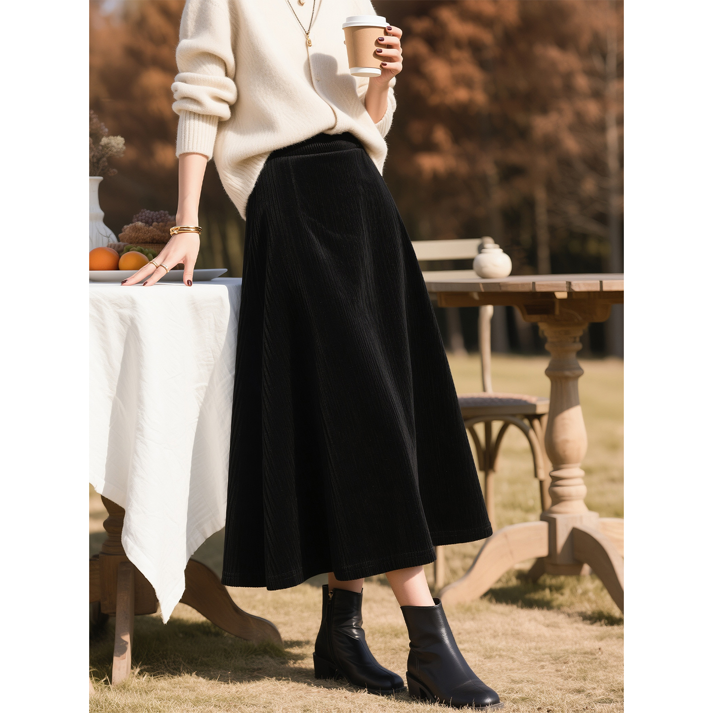 黑色灯芯绒半身裙女2025年秋冬新款 裙子高腰显瘦a字裙子 中长款