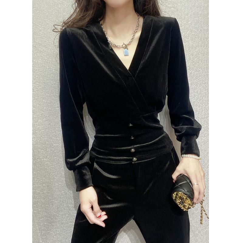 打底衫 上衣V领修身 1010z 女内搭黑色收腰高端感长袖 秋冬金丝绒衬衫