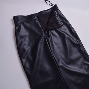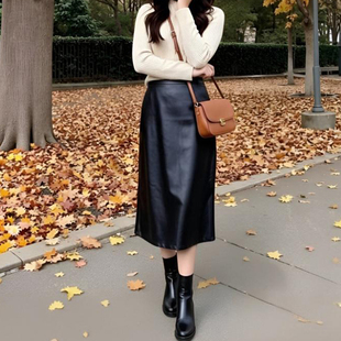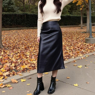 直筒松紧高腰a字裙 气质黑色PU皮女半身裙中长款 2025秋冬季 新款