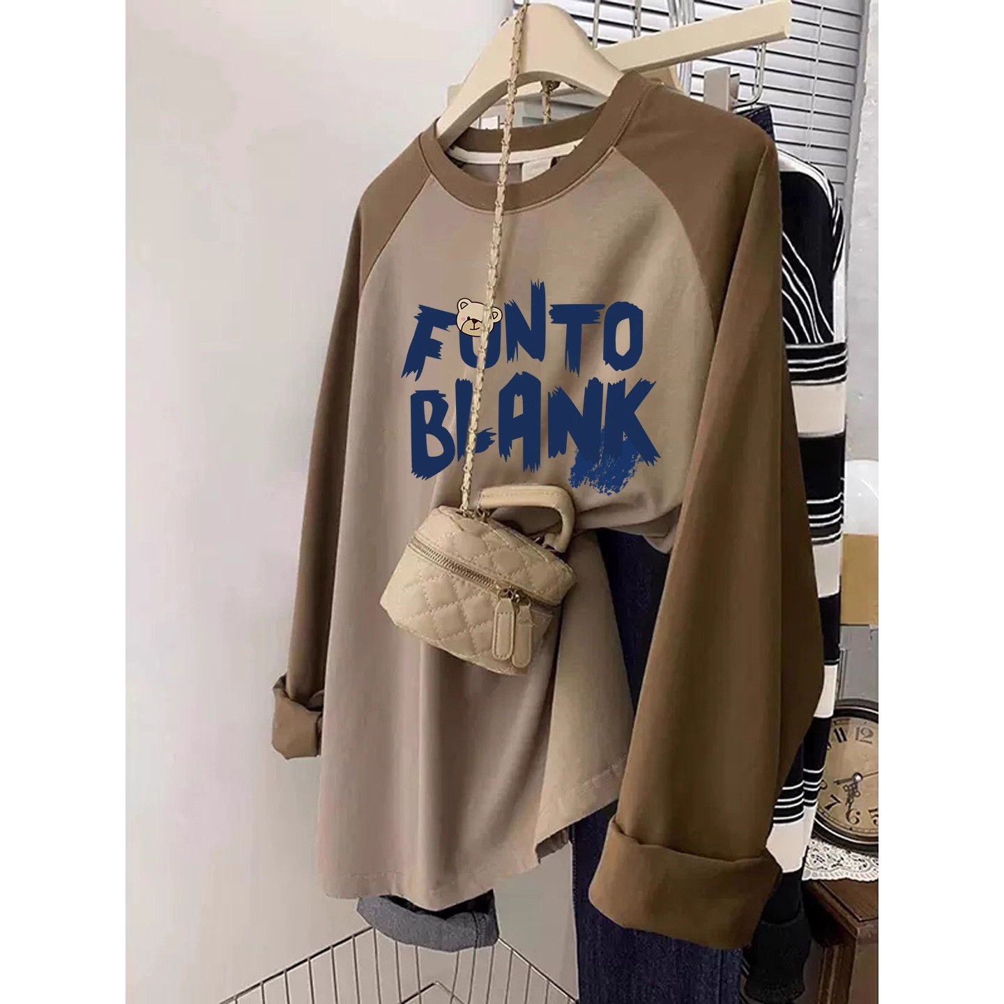 复古宽松休闲显瘦打底衫 秋季 t恤女美式 胖mm插肩纯棉长袖 上衣 大码