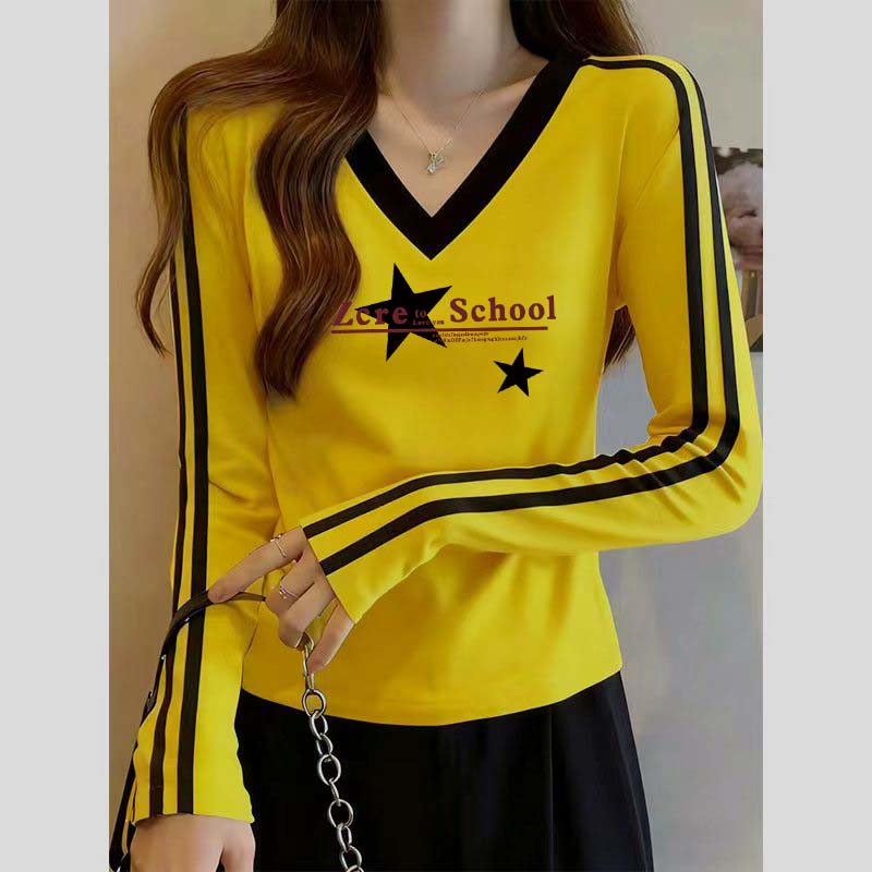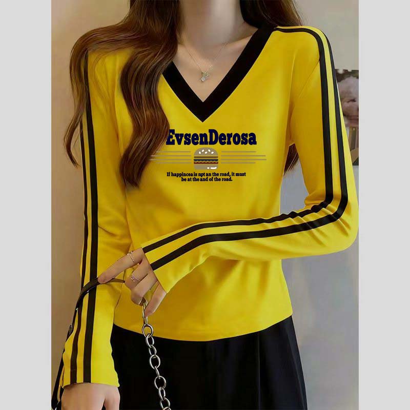 潮酷V领长袖 打底衫 t恤女早秋季 字母印花正肩修身 黄色上衣 新款 美式