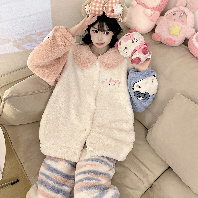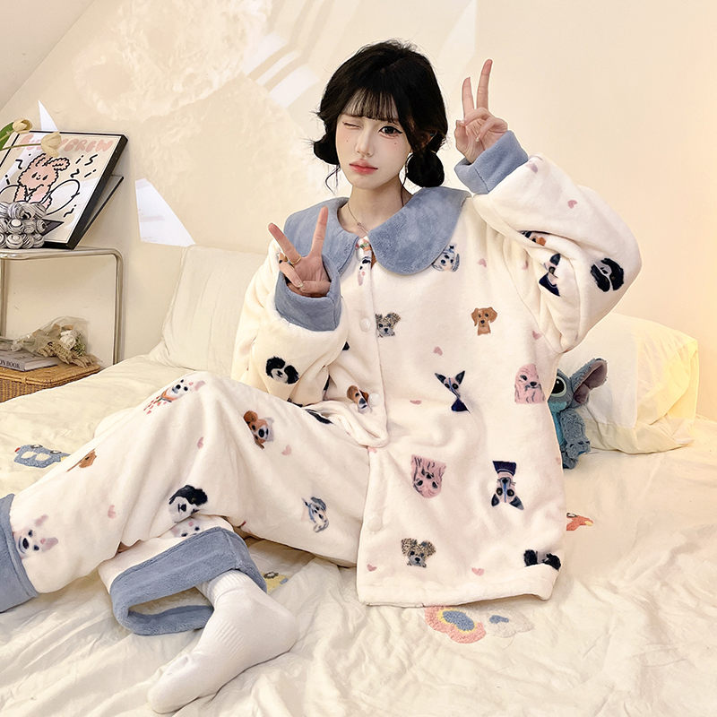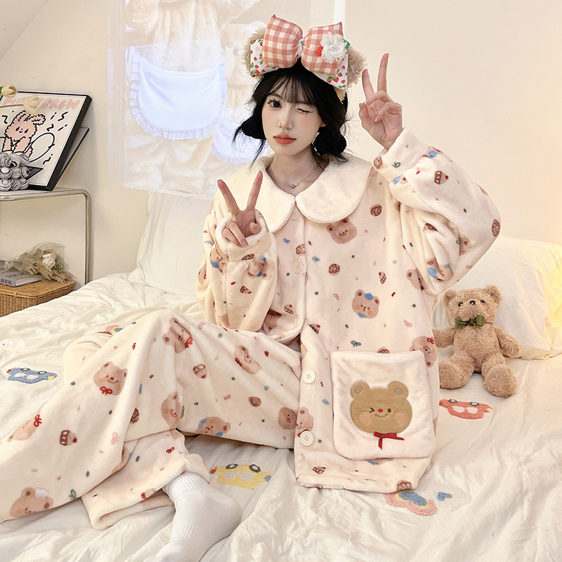 保暖宽松家居服套装 加厚加绒卡通加大码 珊瑚绒开衫 睡衣女士秋冬季