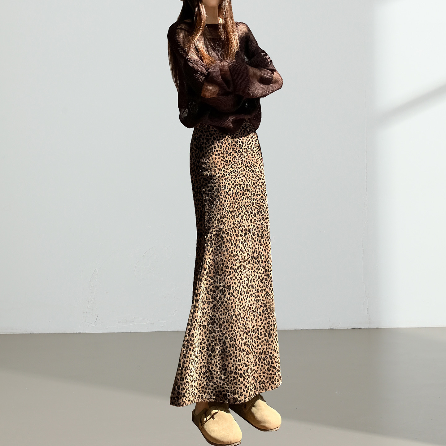 金丝绒豹纹鱼尾裙半身裙女秋冬新款 A字裙中长包臀裙 高腰休闲修身