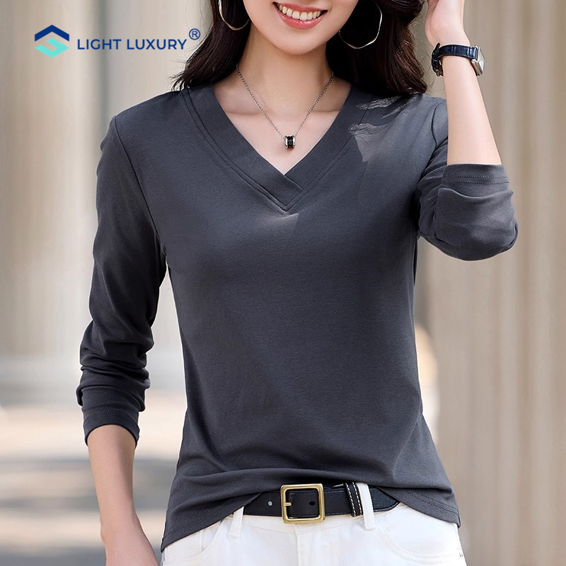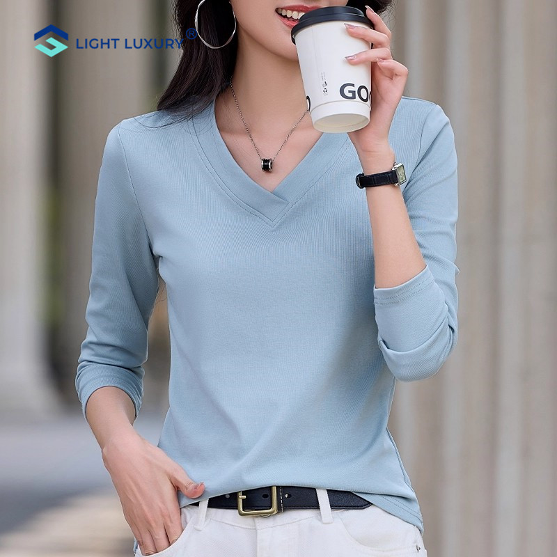 上衣独特别致打底衫 蓝色V领长袖 型正肩大码 版 T恤女宽松洋气修身