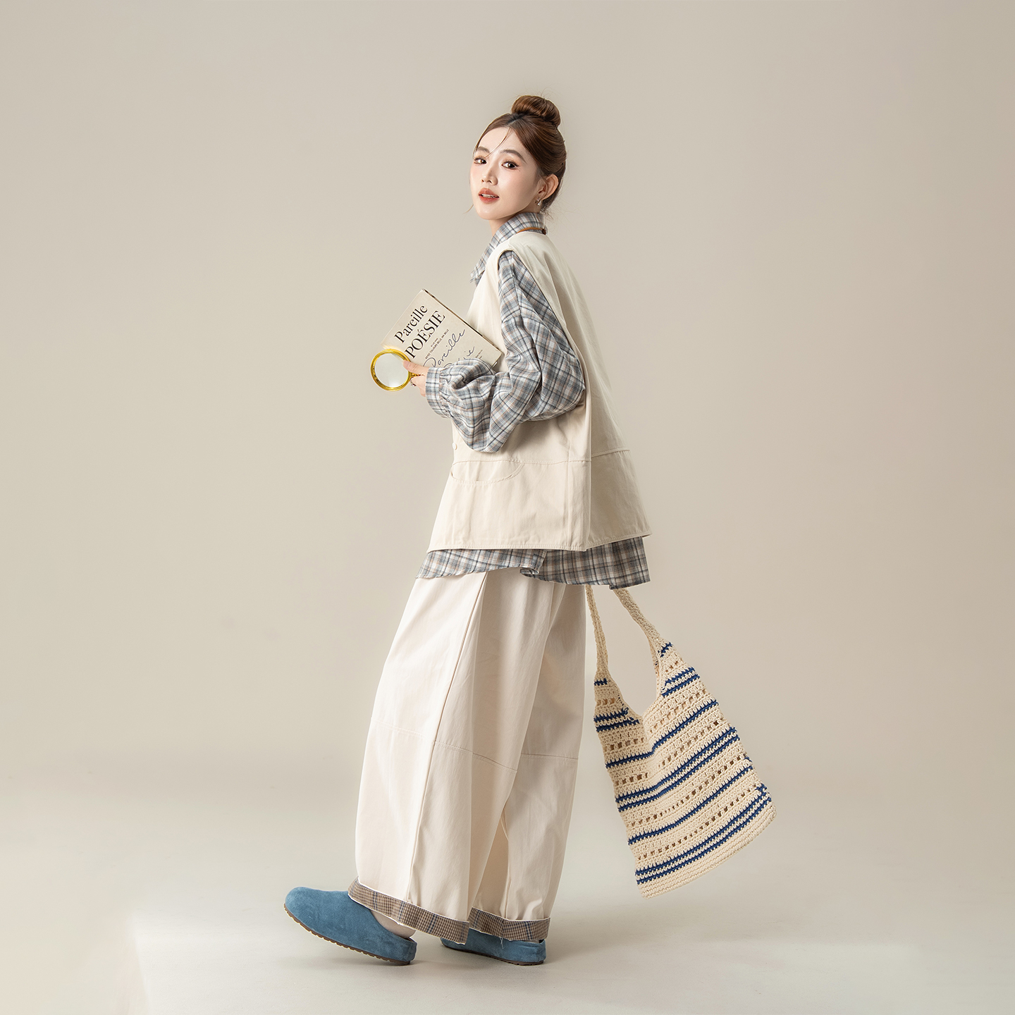 新款 女秋季 叠穿工装 马甲背心卷边阔腿裤 日系复古格子长袖 套装 衬衫
