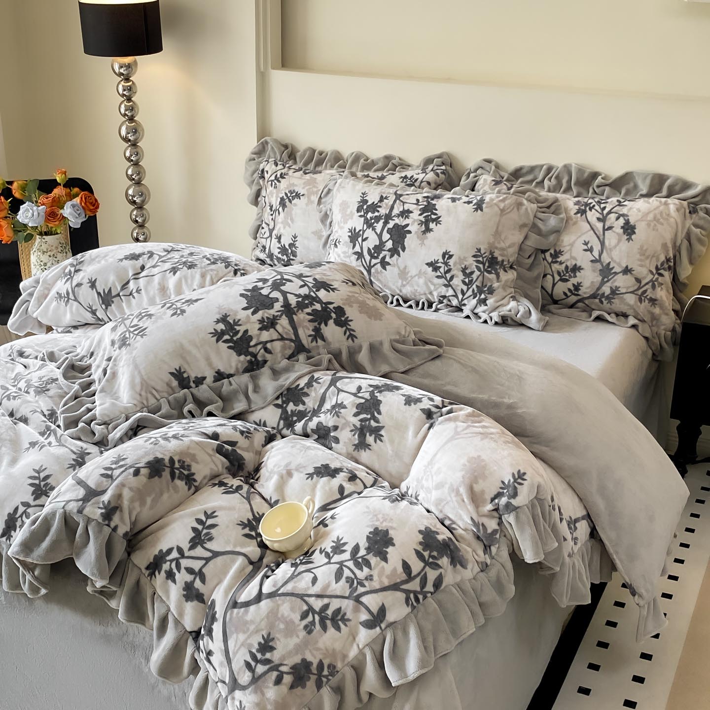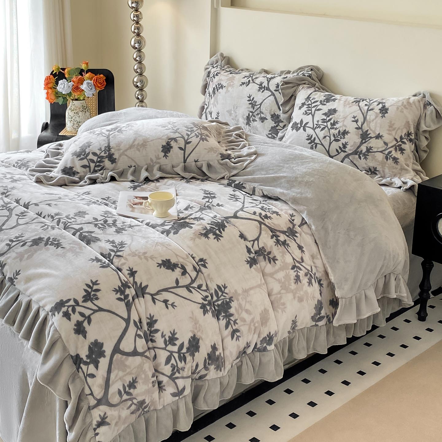 公主风牛奶绒四件套珊瑚绒花边被套加绒床单法兰绒冬季 加厚被罩