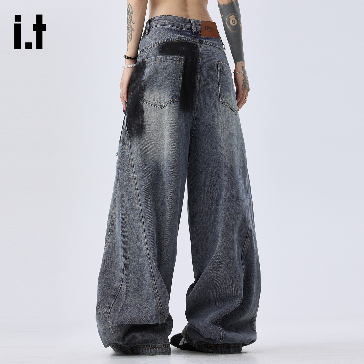 男女2025春秋宽松长裤 FIVECM嘻哈高街破洞涂鸦阔腿牛仔裤 5cm