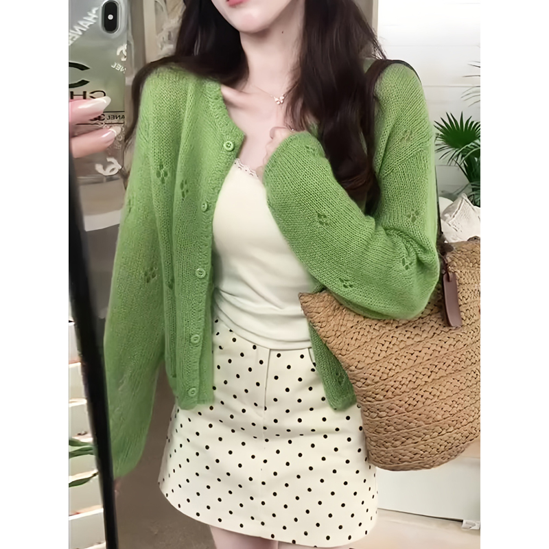 早秋韩系温柔风慵懒宽松外搭镂空针织开衫 上衣巨好看毛衣短外套女