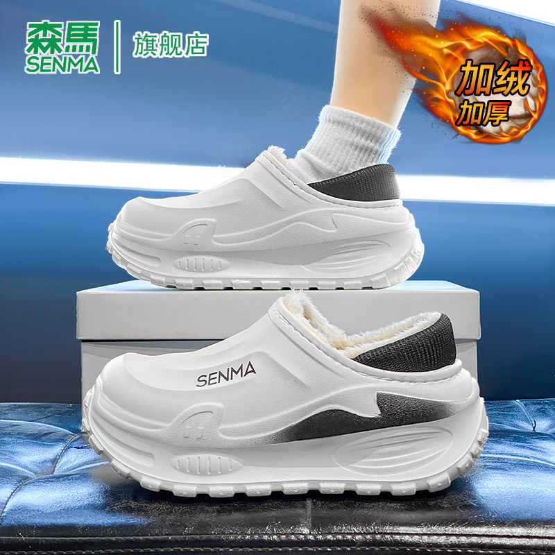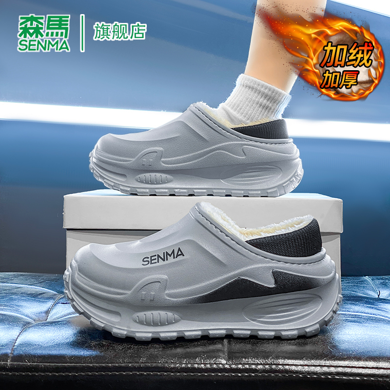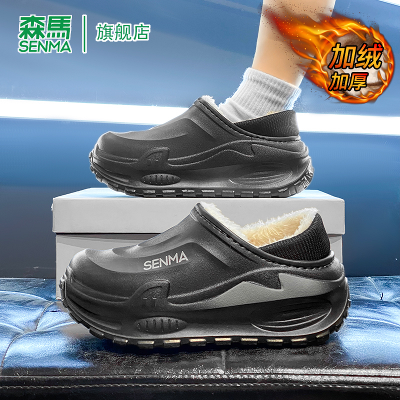 防水防滑加绒保暖毛毛拖鞋 森马包头拖男冬季 厚底情侣棉拖居家新款