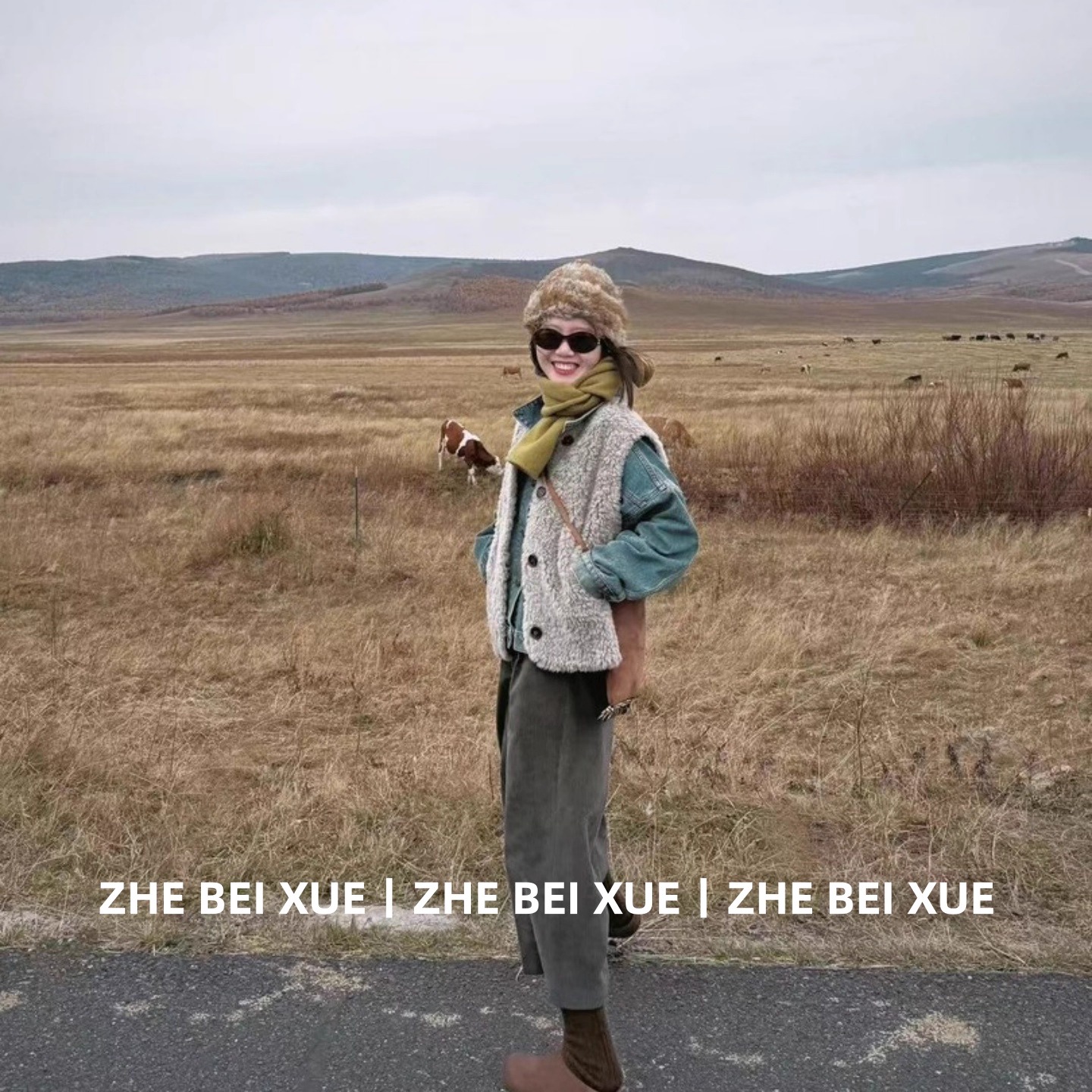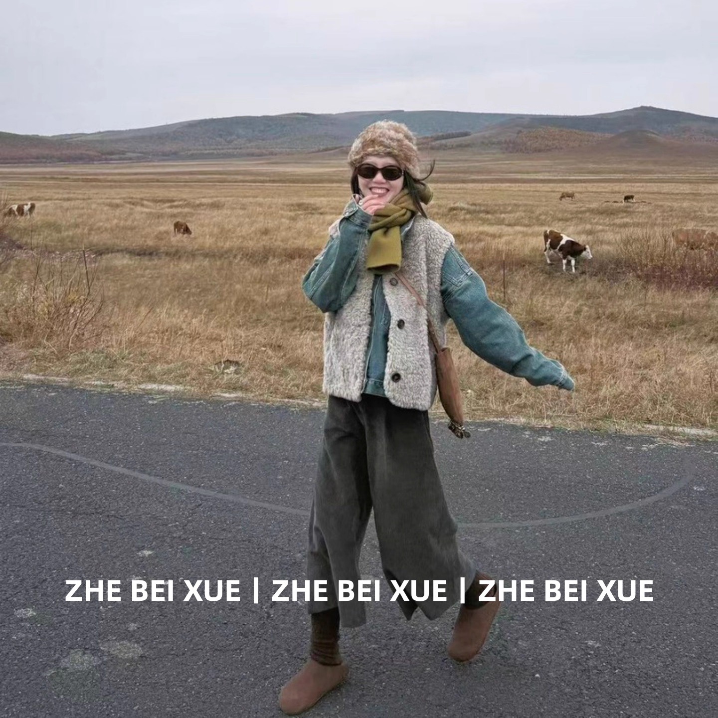 子巨好看 阔腿裤 早秋一整套 女气质毛毛马甲外套复古牛仔衬衫 套装
