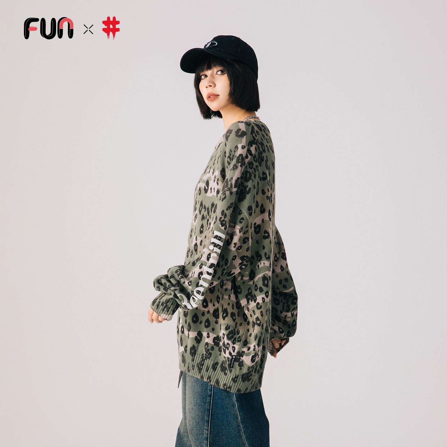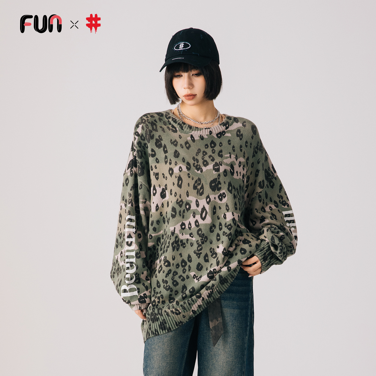 高街潮牌豹纹满印宽松毛衣女情侣同款 Fun2025秋冬季 线下商场同款