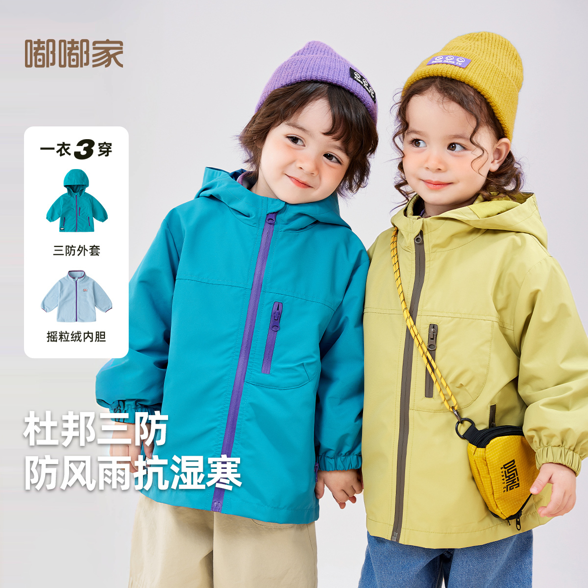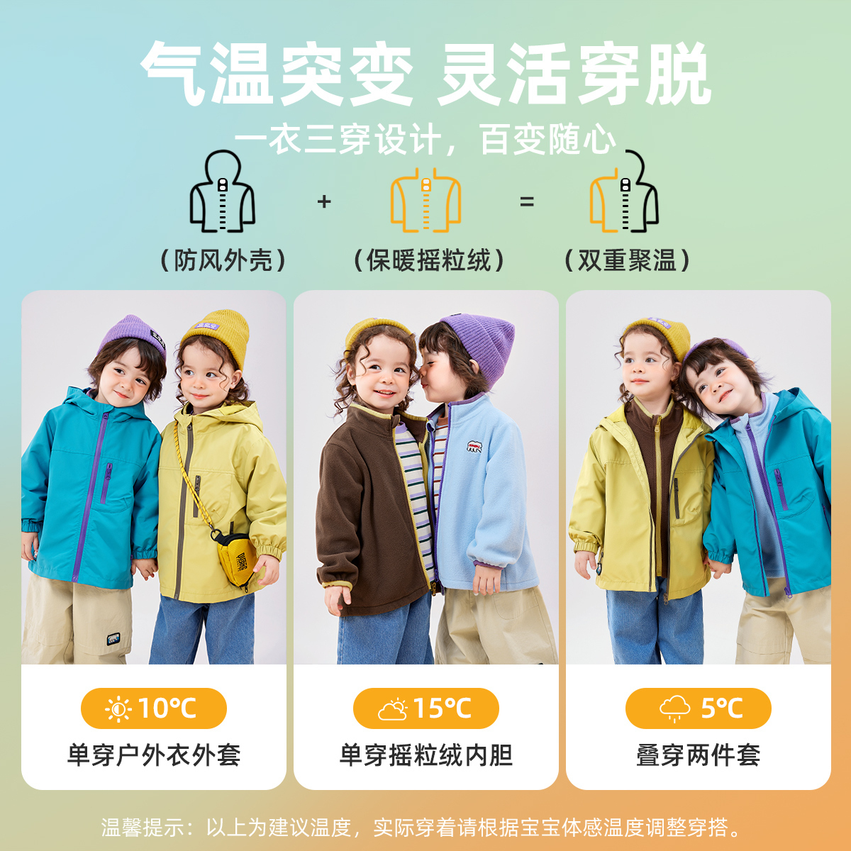 男女童上衣潮 宝宝三穿衣摇粒绒内搭连帽梭织外套秋装 杜邦三防