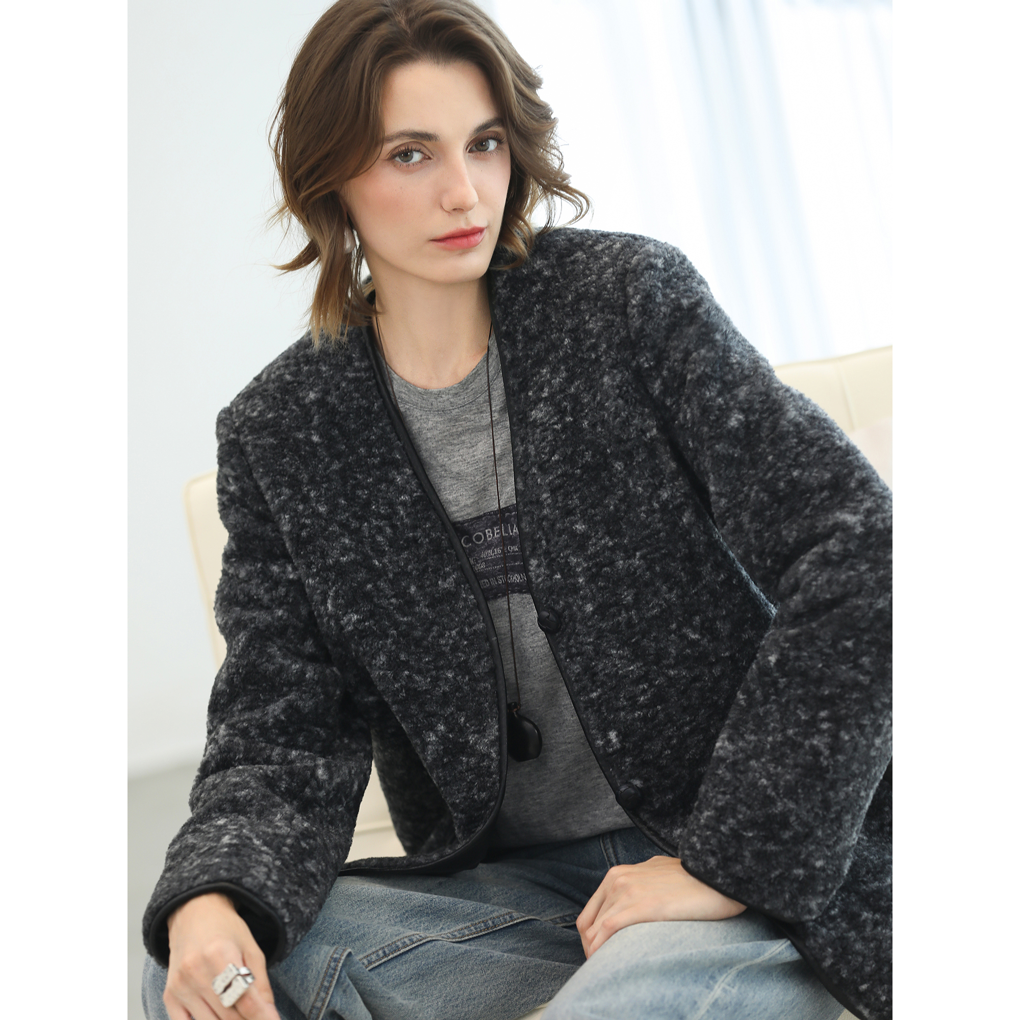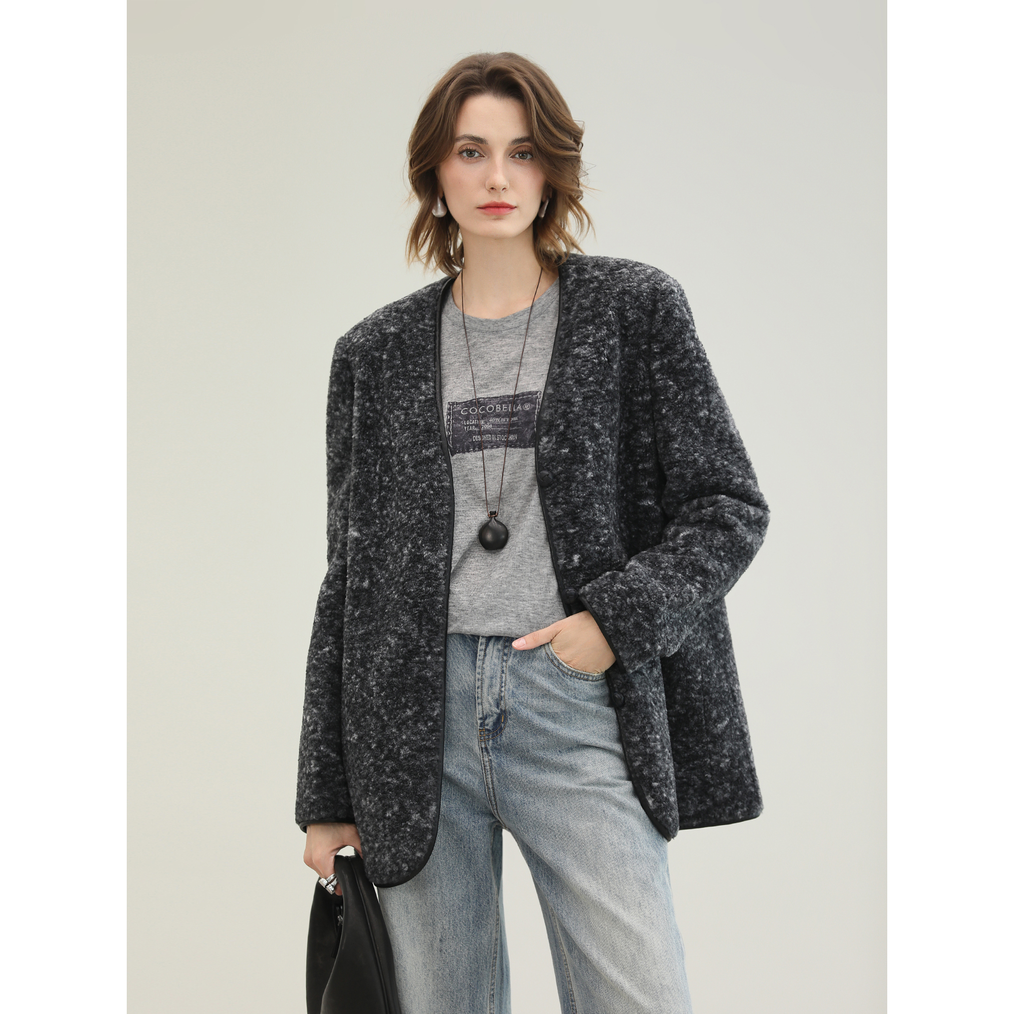 COCOBELLA通勤无领西装 女PU边仿皮毛一体环保皮草外套FU3102