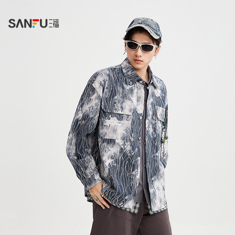 英文刺绣暗纹街头宽松翻领衬衣507847 男长袖 三福2025秋冬新款 衬衫