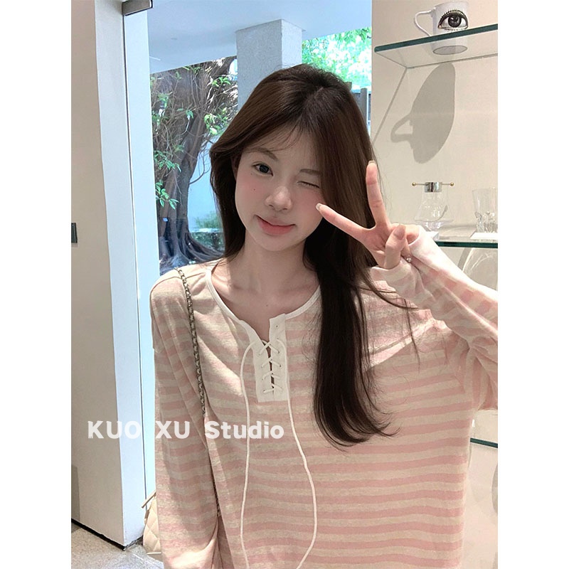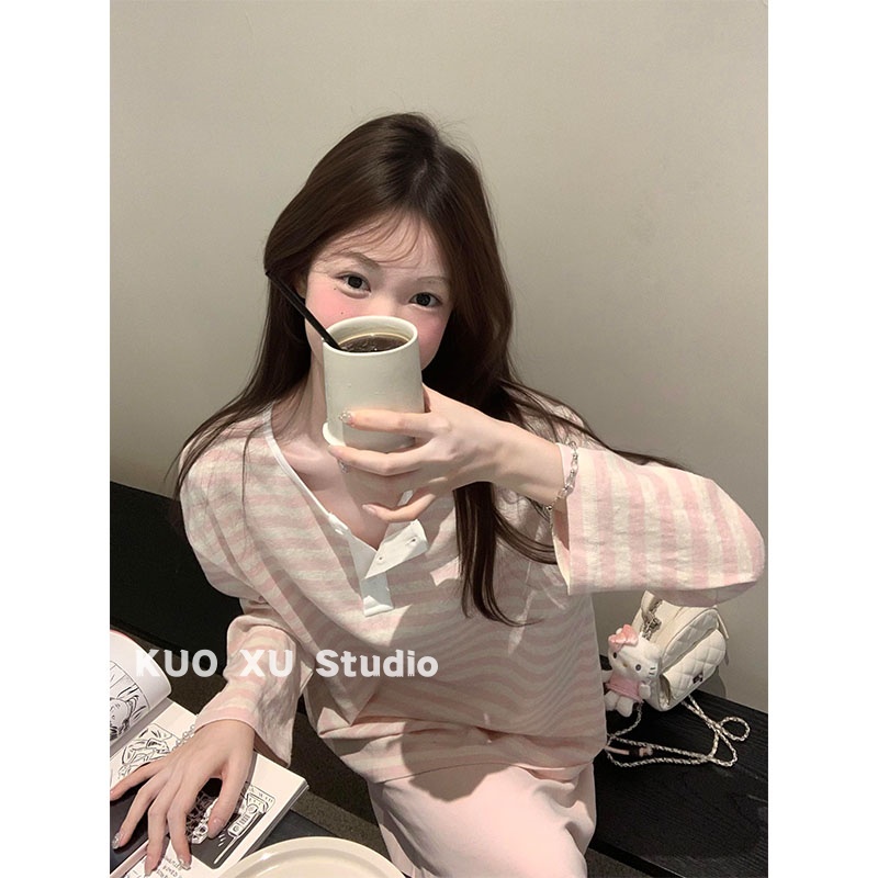 T恤休闲抽绳直筒半身裙a字长裙女 长袖 早秋穿搭套装 条纹宽松打底衫