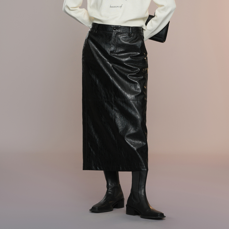 A字裙 休闲美拉德高腰松紧半身裙中长款 紫涵复古PU皮裙女秋季 新款