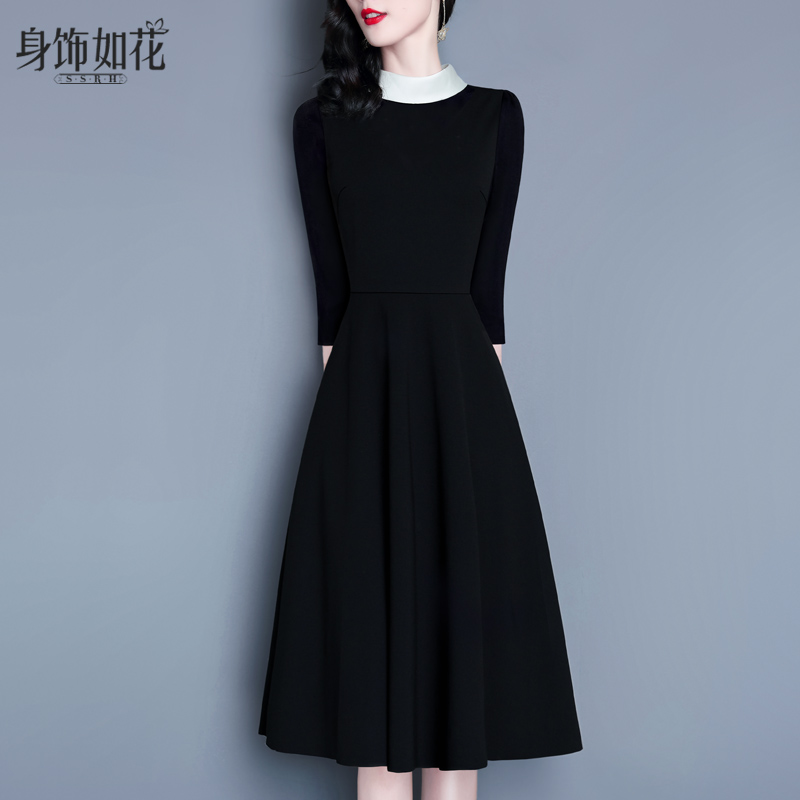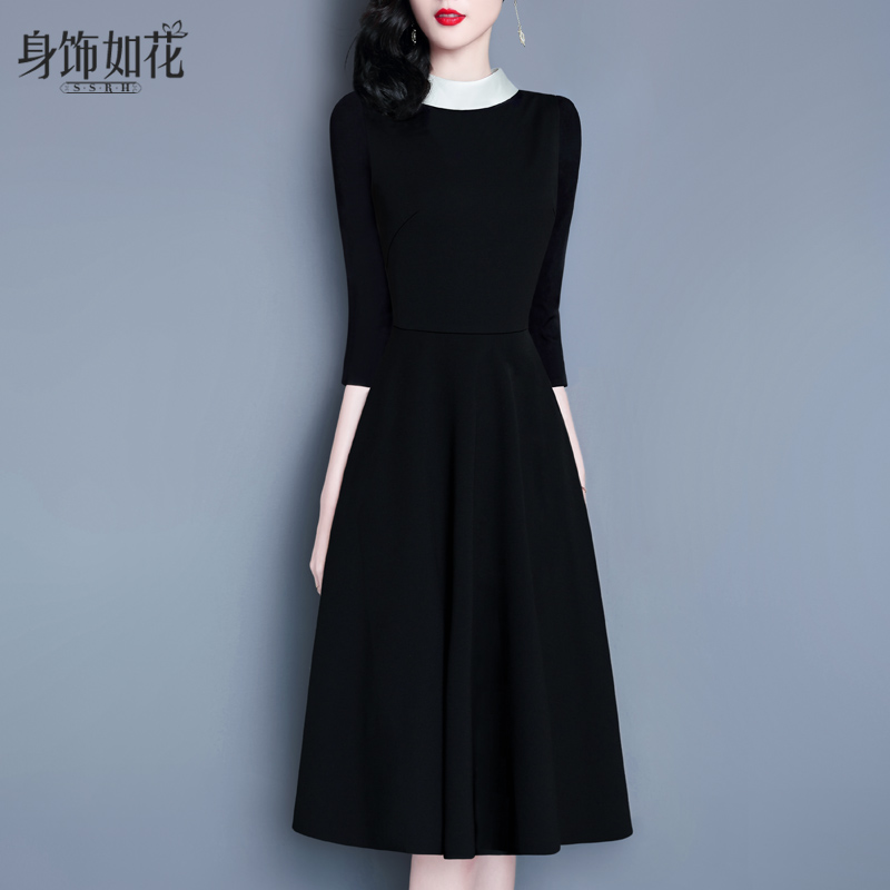黑色拼接七分袖 a字中长款 连衣裙 气质名媛修身 小黑裙2025春秋新款