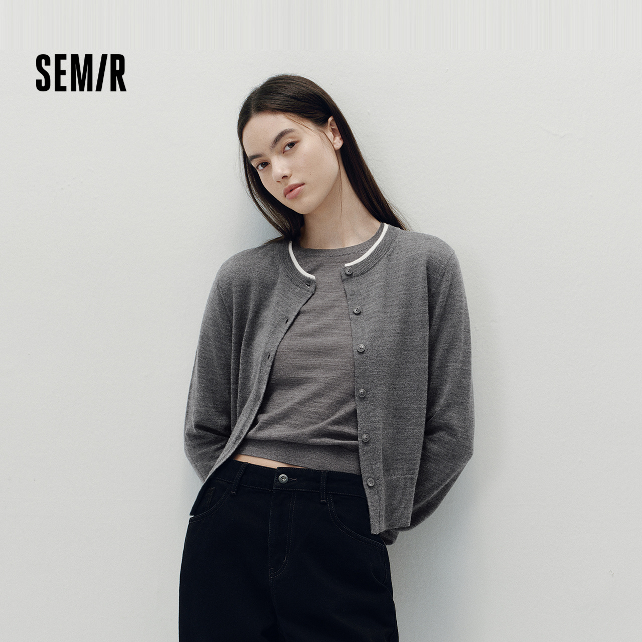 唐狮撞色边设计圆领套头灰色毛衣女2025新款 慵懒风休闲上衣qd 冬季