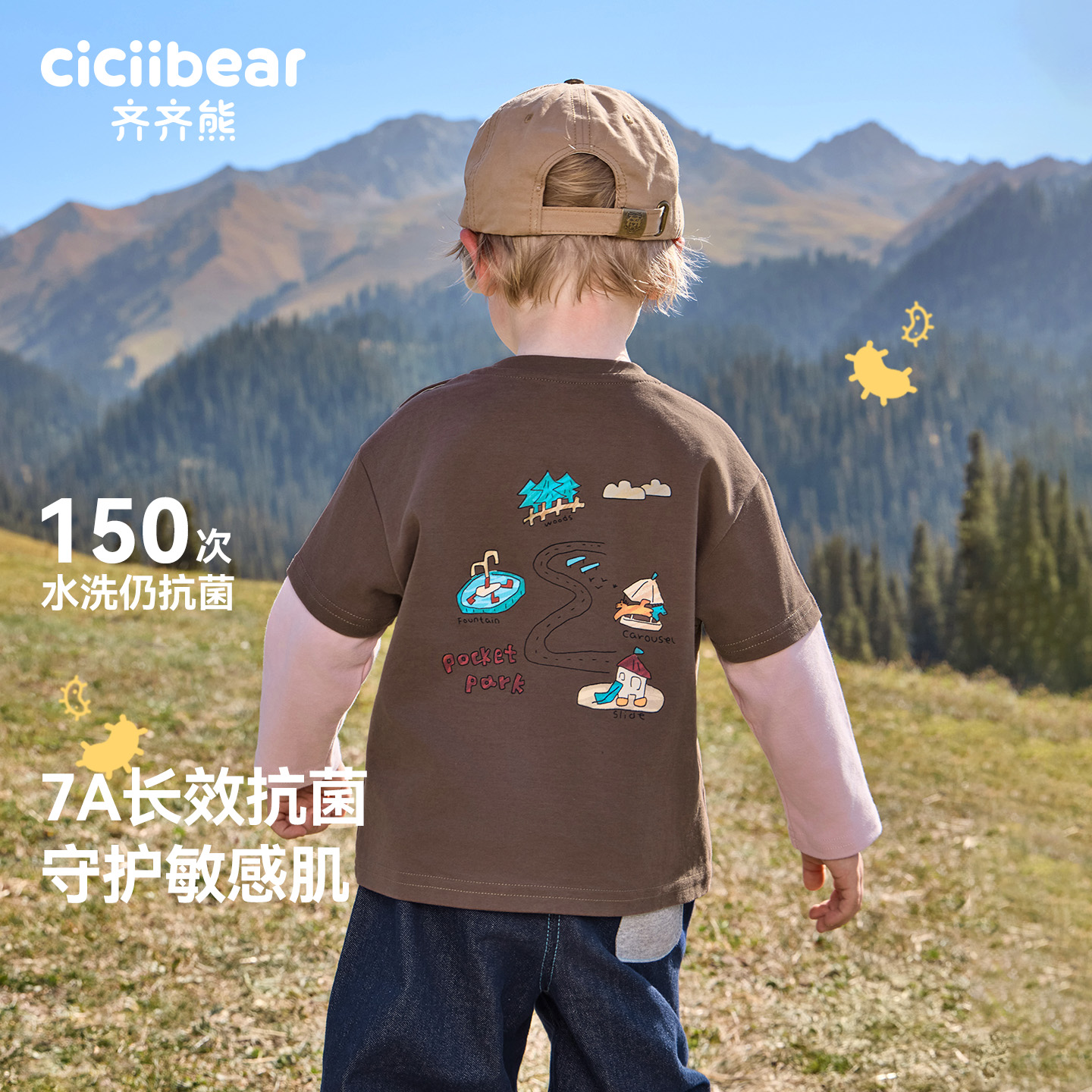 宝宝假两件上衣2025新款 春秋款 齐齐熊男童t恤长袖 儿童女 7A抗菌