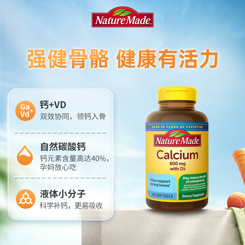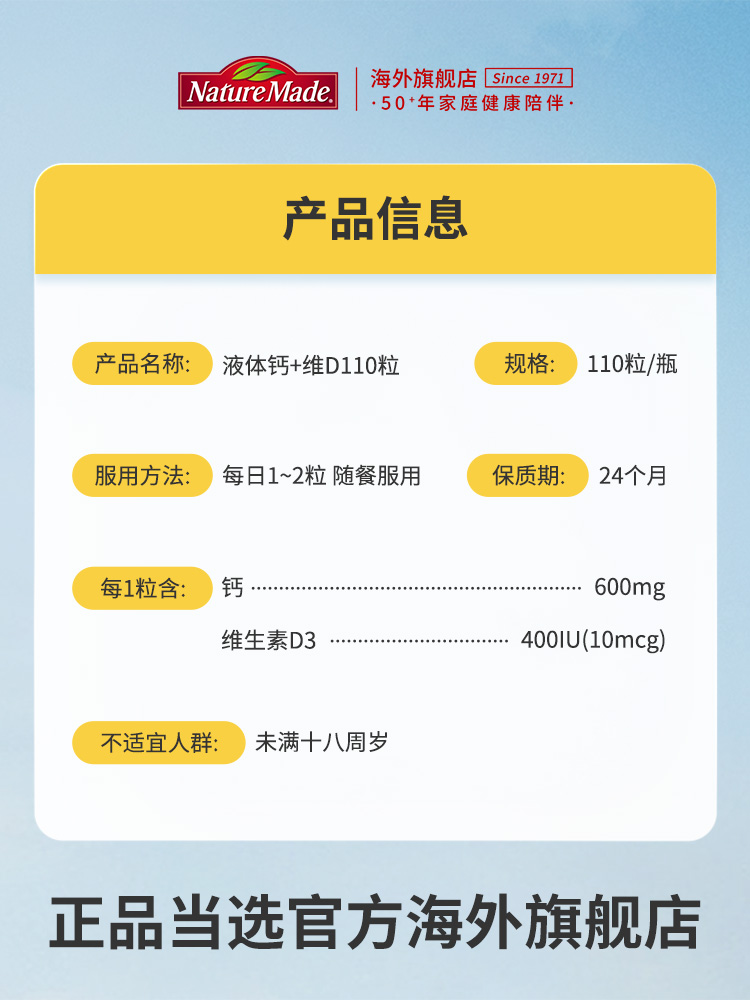 NatureMade天维美液体钙胶囊美国原装 进口中老年人补钙D3胶囊
