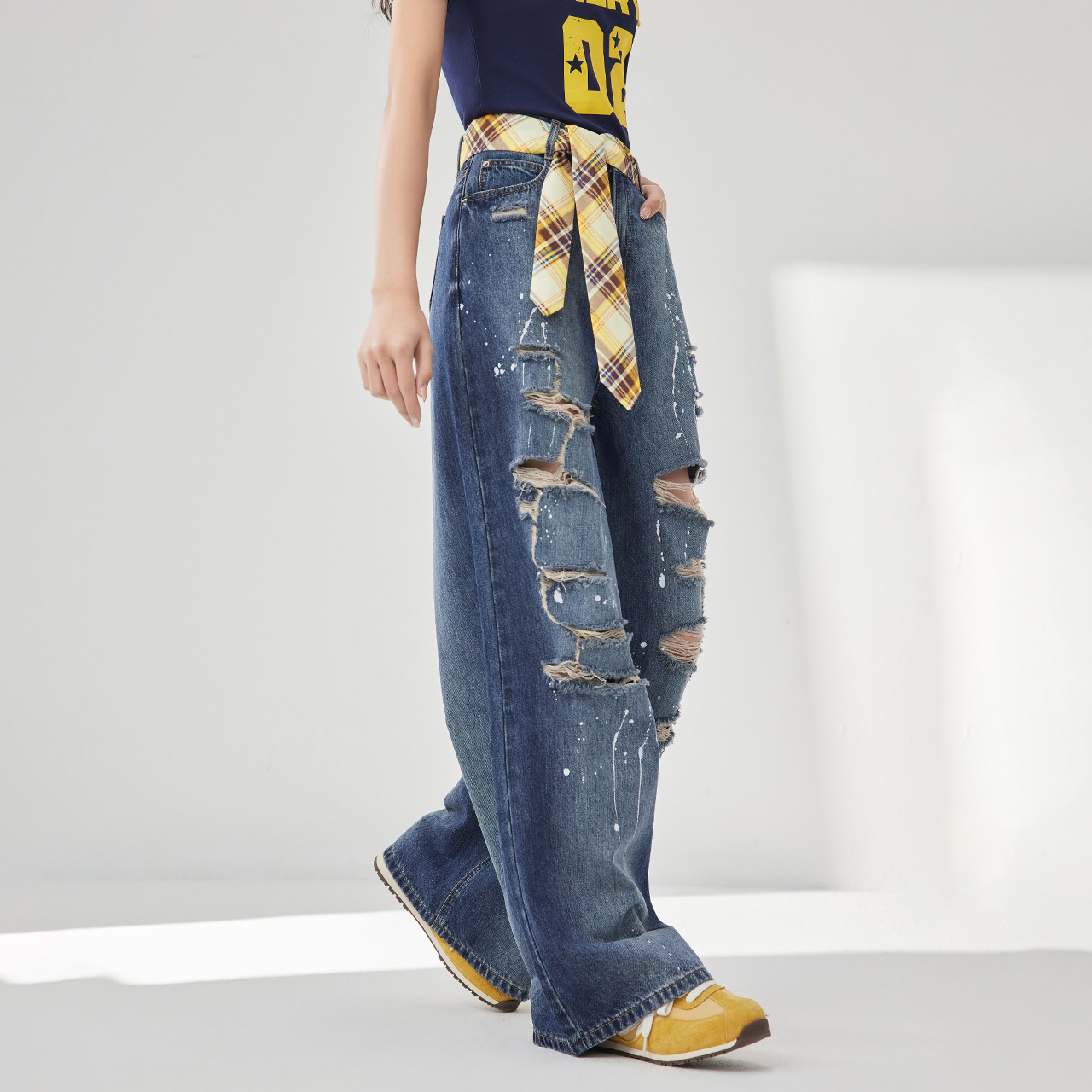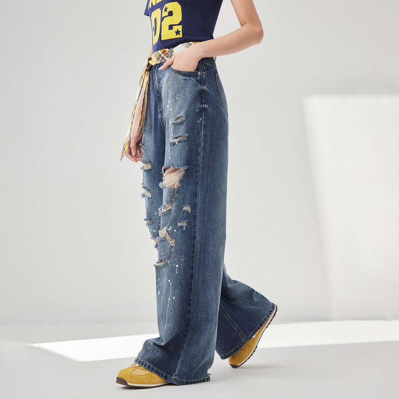 女冬40933286 100%棉复古高腰阔腿直筒牛仔裤 艾诺丝雅诗 建模裤