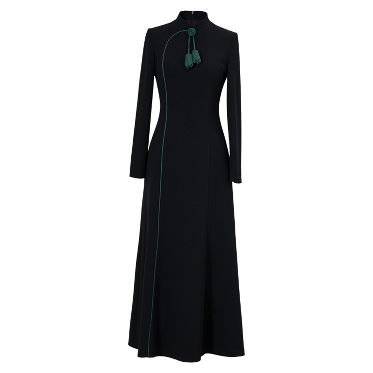 508198 小刺绣撞色拼接翻领A字长裙子女装 三福连衣裙2025新款 秋季